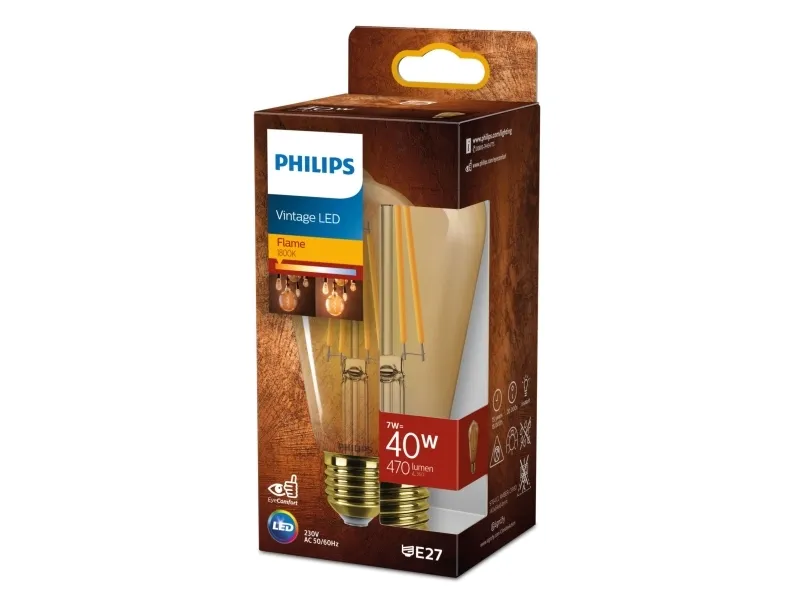 Oppdag Philips Vintage-pæren, en blanding av klassisk design og moderne effektivitet. Denne LED-glødepæren fremhever estetikken i ethvert rom og gir en flammelysfarget belysning som skaper en varm og innbydende atmosfære. Med en fargetemperatur på 1800 K og en lysstyrke på 470 lumen er den både vakker og funksjonell. Philips Vintage er utstyrt med EyeComfort-teknologi for å minimere belastningen på øynene, noe som gjør den ideell for miljøer der folk tilbringer mye tid. Den imponerende levetiden på 15 000 timer, kombinert med 20 000 byttesykluser, gjør denne pæren til et pålitelig og holdbart valg i alle miljøer. Enten du ønsker å tilføre innredningen din et vintagepreg eller ønsker effektiv og behagelig belysning, er Philips Vintage-pæren designet for å dekke dine behov.