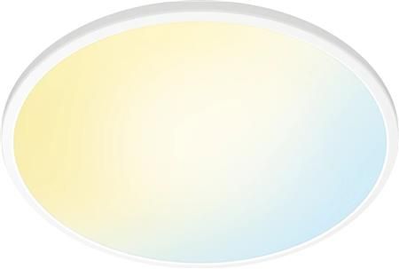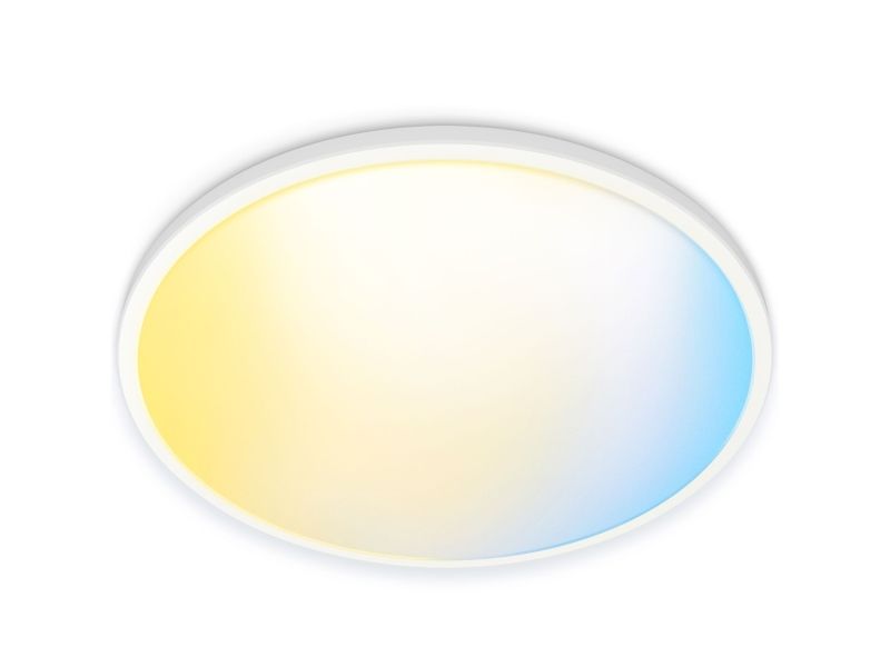 Med WiZ Super Slim er det enkelt å få lys som passer inn i hverdagen. Den store, runde lysflaten fyller rommet med kjølig, blått lys som fremmer våkenhet og konsentrasjon, og dimmes ned til en myk og varm farge som hjelper deg å slappe av.