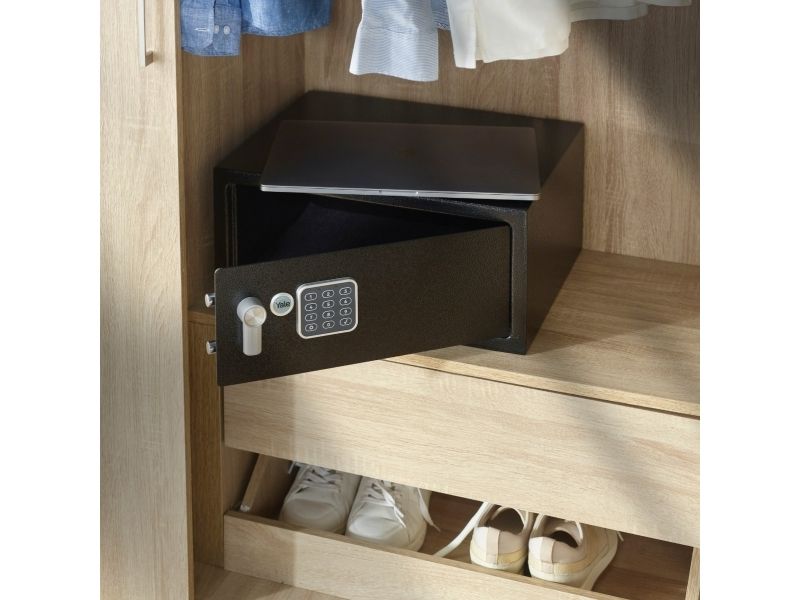 The Yale Value Safe features an electronic lock with over 100,000 combinations of 3 to 8 digit code. User code can be numbers or letters e.g. a memorable name or word. With automatic lockdown, the keypad locks down for 20 seconds after 3 incorrect PIN entries. After 3 more incorrect PIN entries, it locks down for 5 minutes. The locking mechanism contains an anti-bump solenoid with anti-shock magnet to prevent "bump opening". With the carpet interior, you can keep your most important documents and most valuable posessions in a way that you know they are protected, to help ensure delicate items remain in best condition.