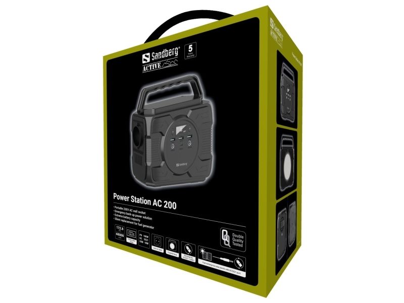 Sandberg Power Station 200 AC is your mobile power source. You will have plenty of power for all your mobile equipment, for example, mobile phones, tablets, laptops and, the most important thing, a regular 230V AC mains outlet able to output up to 200W. Perfect for your camping trip, on the boat, when you work in the garden, at a music festival, for all your video equipment, or as a backup power solution at home or at your job to support your power needs in case of a power outage.