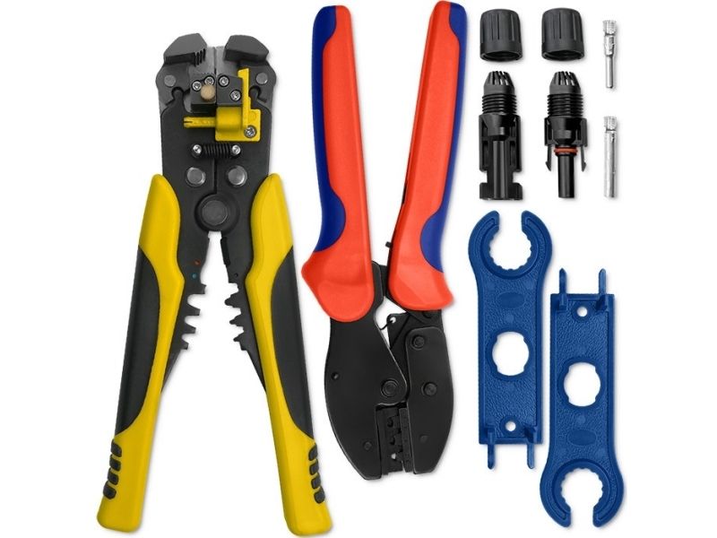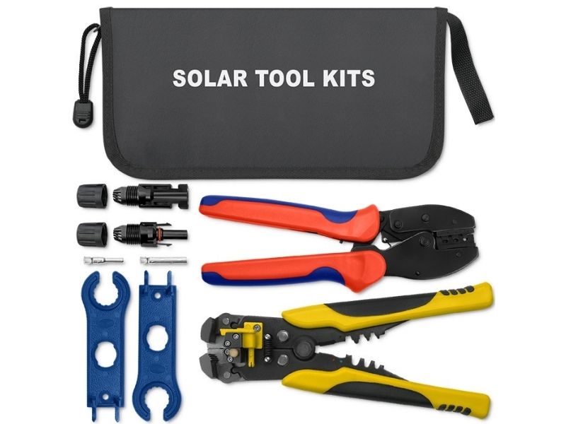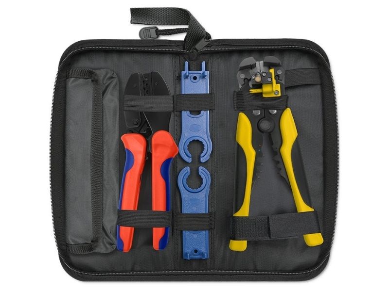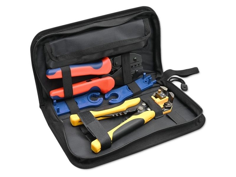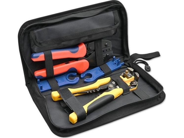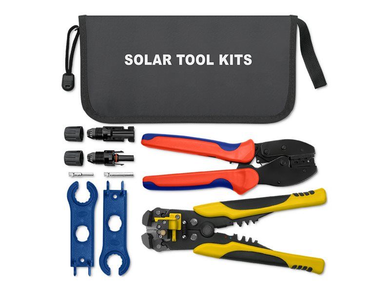 The Qoltec solar tool kit is an essential collection of power accessories and tools designed to streamline the installation and maintenance of solar panels. Compatible with MC4 connectors, this kit includes a crimping tool and an auto wire stripper, ensuring that you have the right tools for every step of the process. The package also contains 2 MC4 connectors and 2 MC4 solar connector wrenches, providing the essentials needed for secure and efficient solar panel connections. All these tools are neatly organized in a durable storage case, making it easy to carry and store. Whether you're a professional installer or a DIY enthusiast, this solar tool kit from Qoltec is designed to meet your solar project needs with precision and ease.