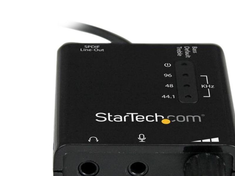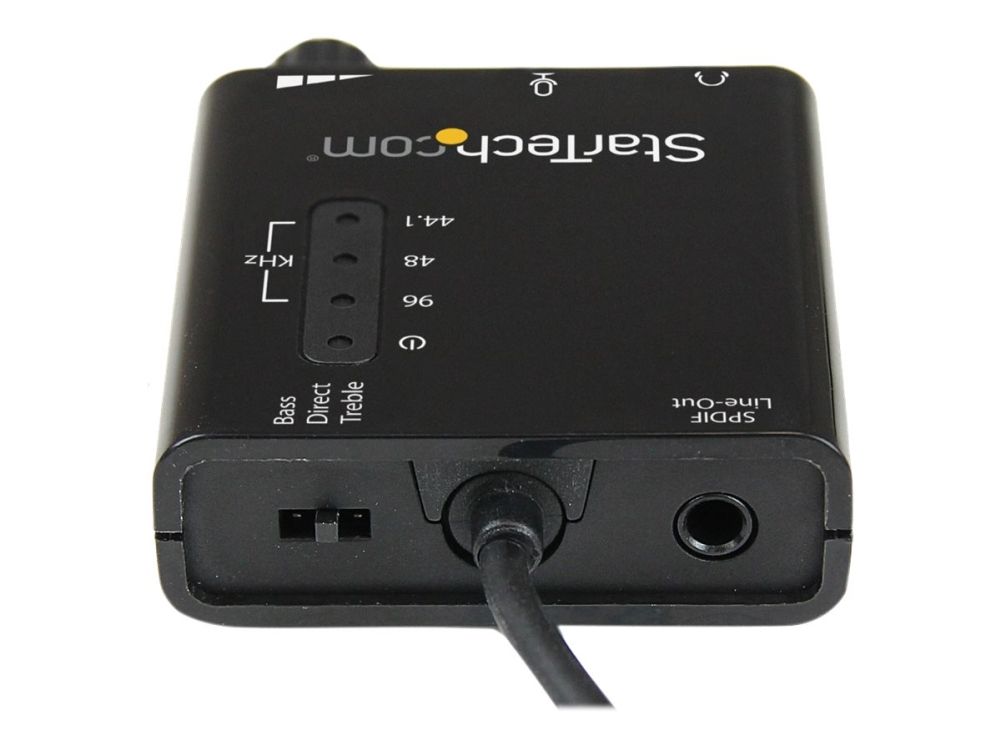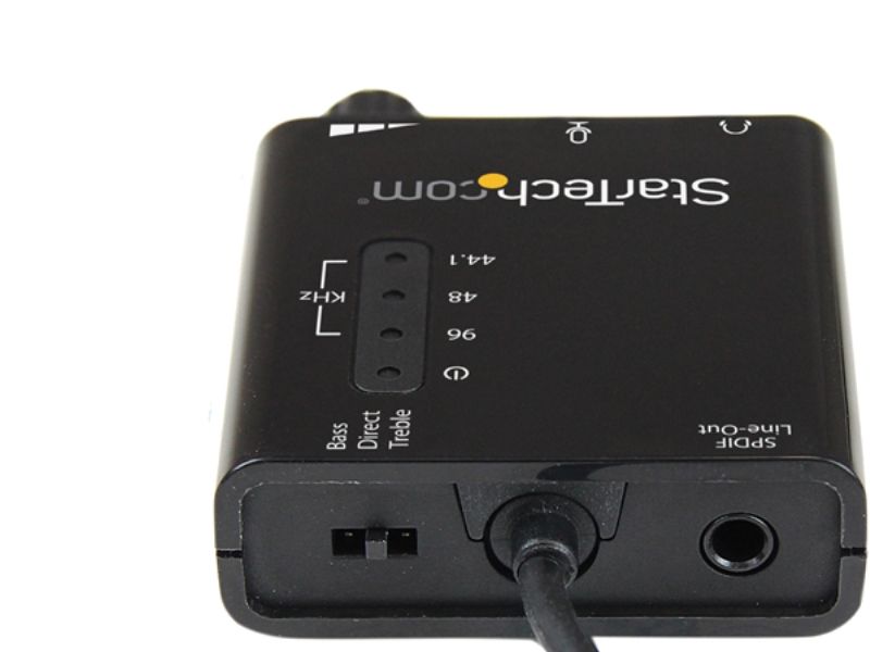 This versatile USB audio adapter features an integrated 3.5mm 4-position TRRS connection for your headphones or combination headset/microphone. Also a convenient external volume control for quick adjustments, a hardware EQ switch for Bass or Treble boosting, and an LED status bar to display the current sampling rate.