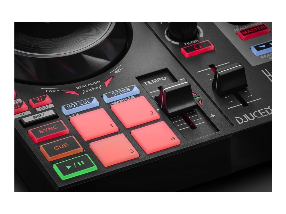 ALL-IN-ONE KIT 2-deck DJ controller with built-in audio interface. Full version of the DJUCED software for PC/Mac included. Active speakers (2 x 15 W RMS) for mixing at home. DJ headphones for monitoring upcoming tracks.