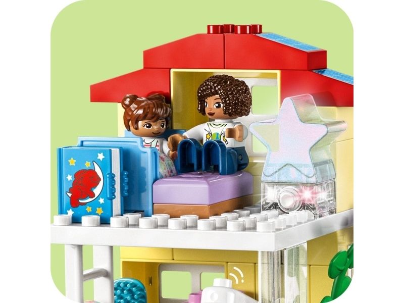 Passer for barn som liker å leke mor, far og barn Dette lekehuset gir små barn utallige læringsmuligheter. Gjennom lek kan de lære om leggerutiner, inkludert tannpuss og høytlesning i køyesengen, og skape en koselig stemning med lysklossen i stjernelampen. De lærer også om sunn mat på kjøkkenet eller ved å plukke tomater og gulrøtter i hagen. I garasjen står det en byggbar elbil som «lades» av solcellepaneler, og er utstyrt med en gøyal «skyv og slipp»-funksjon for actionfylt lek.