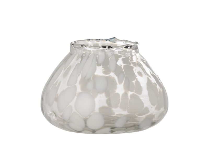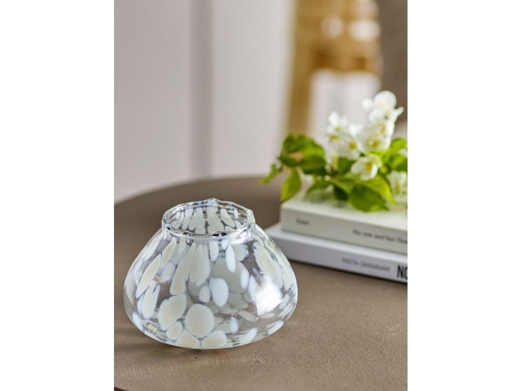 Hertha Fyrfadsstagen fra Bloomingville er en smuk fyrfadsstage i glas, med et specielt mønster af hvide prikker i en organisk form. Placer et fyrfadslys indeni for at skabe et smukt lys i rummet.