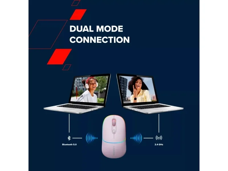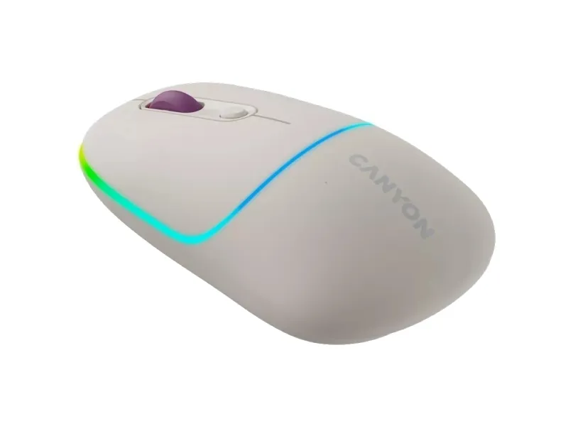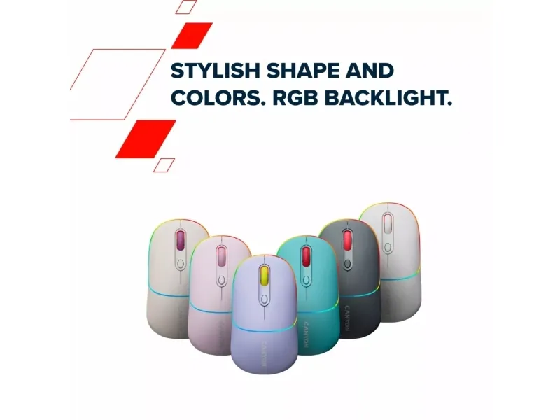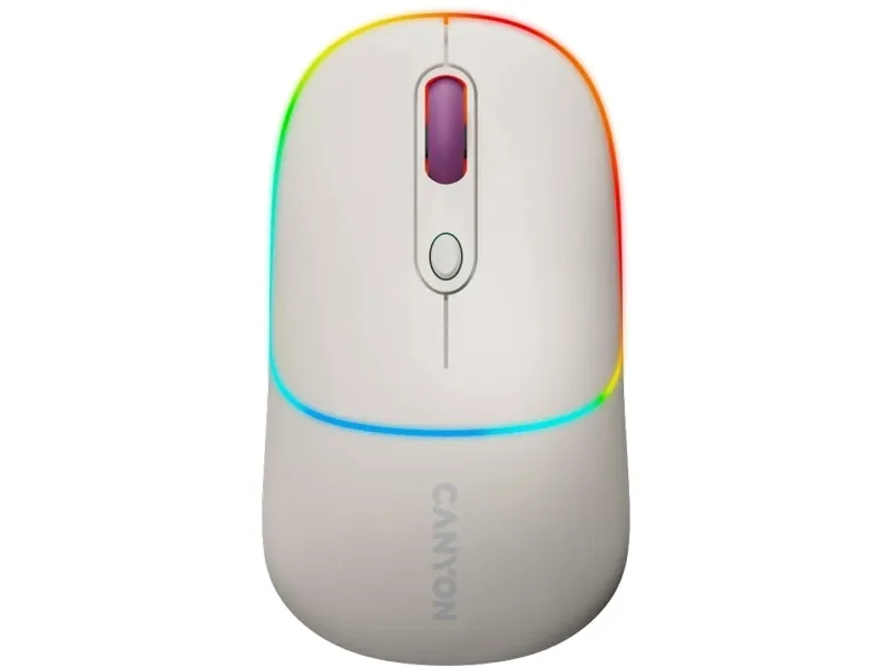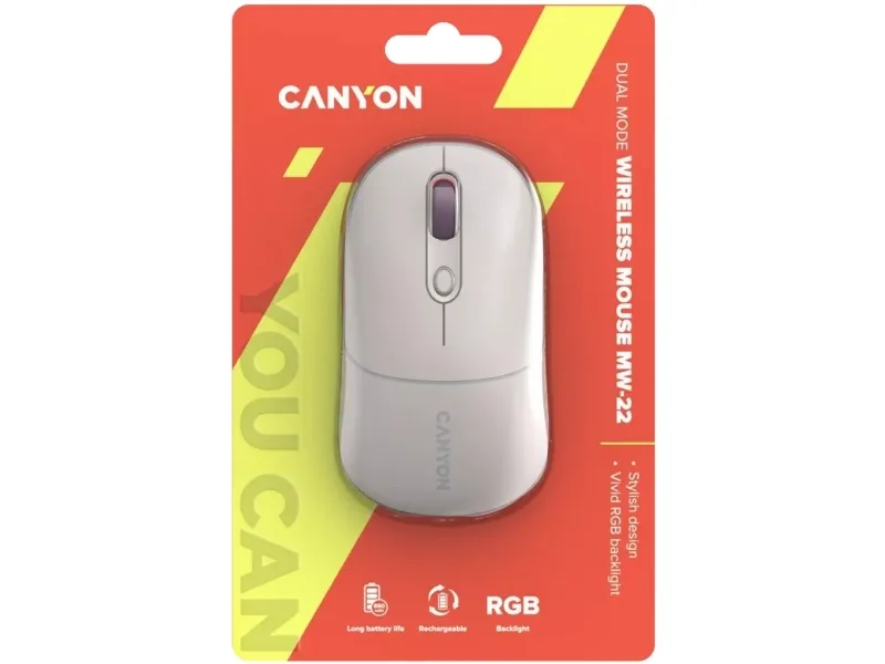 This Canyon MW-22 is a compact mouse with many aces up its sleeve. It is dual-mode wireless: you can connect it via Bluetooth 5.0 or 2.4GHz USB dongle, so pick a connection that suits your needs. Under the hood, we have an optical sensor of variable DPI setting up to 1600. The battery is rechargeable and has quite a long life due to its capacity of 650mAh and smart energy-saving mode. There’s also an RGB backlight, where you choose between 15 modes or turn it off completely to get even more longevity. When you need to recharge, this mouse offers a Type C charging port – and we have the 80cm cable included in the package. Four buttons are guaranteed to withstand at least 3 million clicks, so don’t be shy and click whatever you want. All that goodness comes in 6 pastel colors: a fresh touch to your working setup. Give your old mouse some rest – it’s time to stand out.Canyon MW-22. Form factor: Ambidextrous. Movement detection technology: Optical, Device interface: RF Wireless + Bluetooth, Movement resolution: 1600 DPI, Buttons type: Pressed buttons, Buttons quantity: 4, Scroll type: Wheel. Illumination colour: Multi. Power source: Batteries. Product colour: White