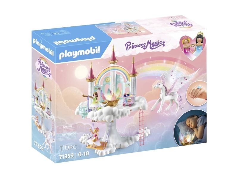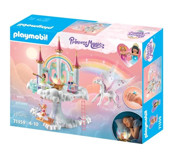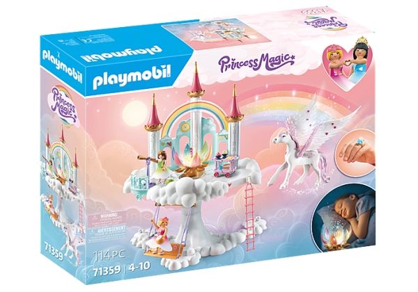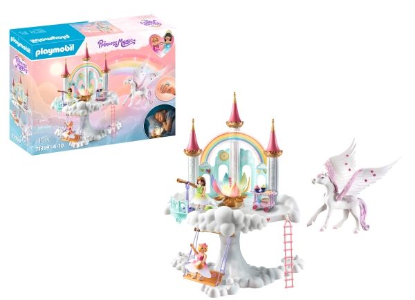 Højt oppe i de bløde skyer finder man regnbueprinsessernes himmelske hjem. Beskyttet af regnbuen og af lyset fra den magisk lysende regnbueblomst* (udtagelig) nyder de livet. Highlights: Pegasus, himmelgynge og prinsesse med fjerlette skynederdele, som kan udskiftes. Inkl. søde klistermærker til at dekorere med og sommerfuglering til barnet! Flere skyer kan tilbygges til slottet. * Bruger 3 x 1,5-V-batterier (AAA) Det himmelske regnbueslot fra PLAYMOBIL tager børn fra 4 år med til et romantisk himmelrige fyldt med fortryllende figurer, magiske fabelvæsner og eventyrlige bygningsværker. Beskyttet af regnbuen og lyset fra regnbueblomsten sørger prinsesserne for, at alle levende skabninger har det godt. I kombination med legesættet Himmelsk babysky (71360) og Himmelsk påklædningssky (71408) opstår en stor, farverig regnbuescene.