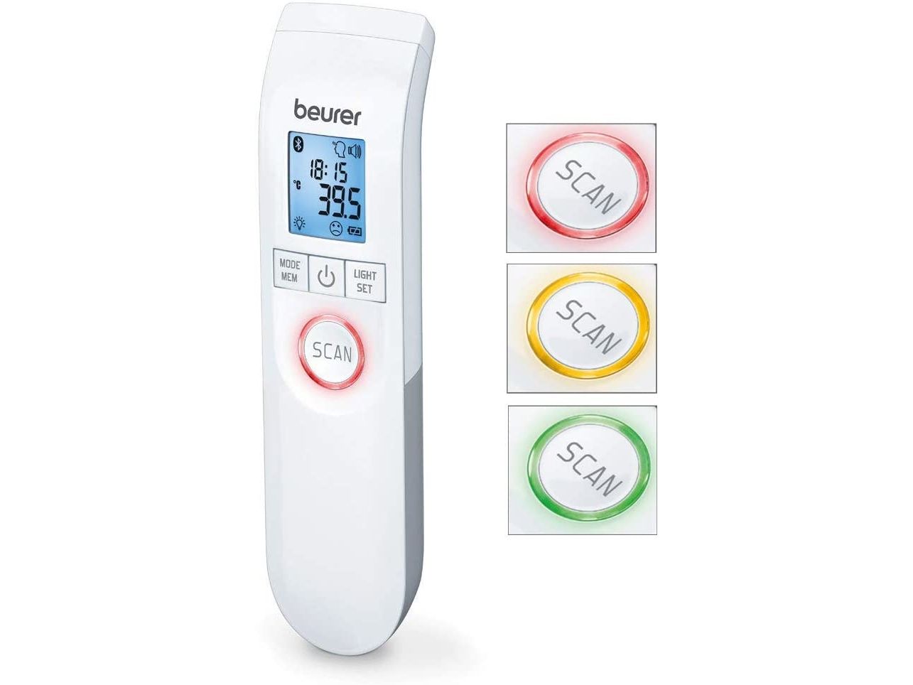 LED ringen der omkranser scan-knappen, lyser enten grøn, gul eller rød efter endt måling, for hurtigt at informere, om der er målt feber.