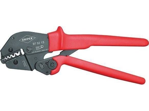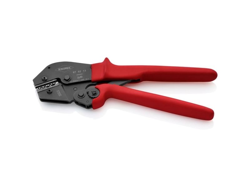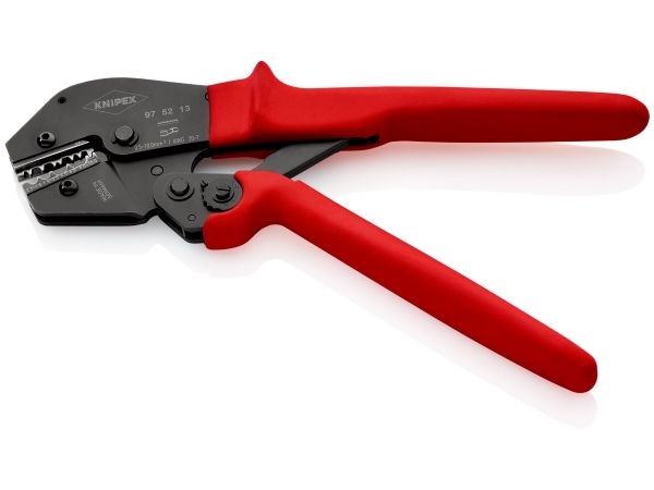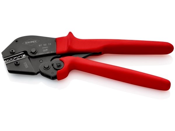 97 52 13 Crimptang Til loddefrie elektriske forbindelser. Håndkraften er op til 30% mindre end ved almindelige crimptænger på grund af ny vægtstangsudveksling. Konstant høj crimpkvalitet takket være præcisionsindsatser og tvangslås ( kan låses op). Crimptrykket er præcist indstillet (kalibreret) fra fabrikkens side. Tohåndsbetjening for let crimpning af store ledertværsnit. God håndtering pga. velafbalanceret tyngdepunktposition, afbøjet hoved og ergonomisk formede greb. Crimpindsats kan ikke udskiftes.
