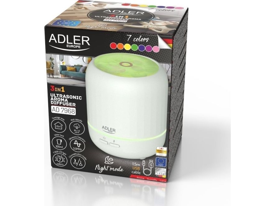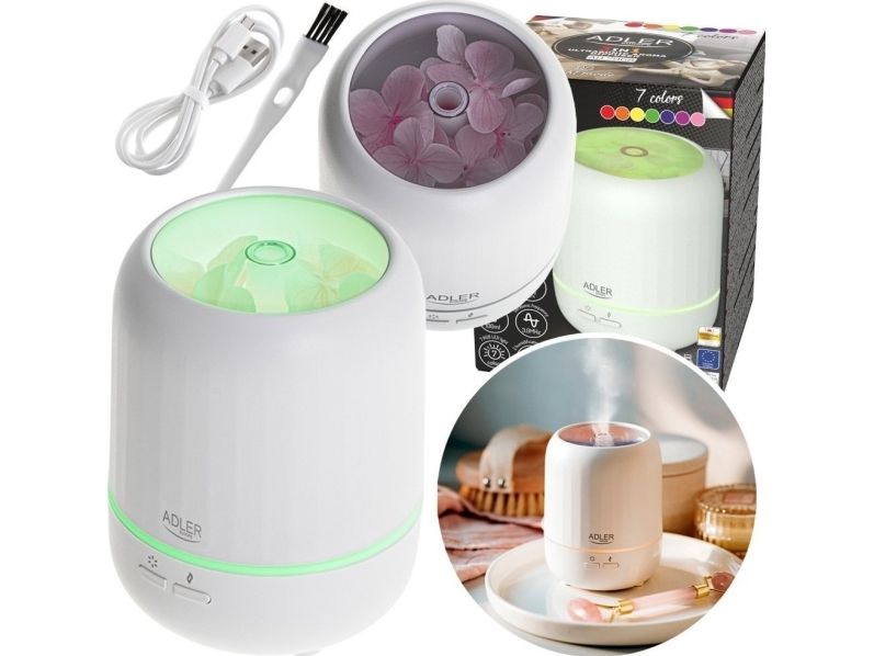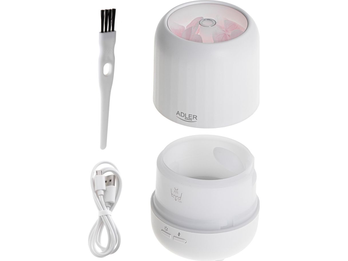 3 functions: - aromatherapy, gentle humidification, atmospheric lamp Water tank capacity: 100ml, Lighting 7 color. Humidification capacity: 18 ± 6ml/h Aromatherapy function. Working time on one water filling: up to 4 hours, Power supply: USB cable, 5V DC