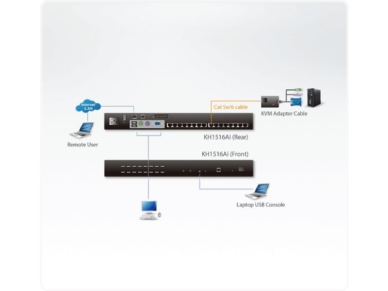 In addition to TCP/IP connectivity, the KH1516Ai provides KVM ports for a locally attached USB and/or PS/2 console and a Mini-USB port for a VNC Laptop console - allowing access and control from the data center, over the Net, or from a laptop's USB connection. This is a single bus unit, so although up to 32 users may be logged in simultaneously only one operator has control.