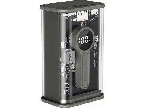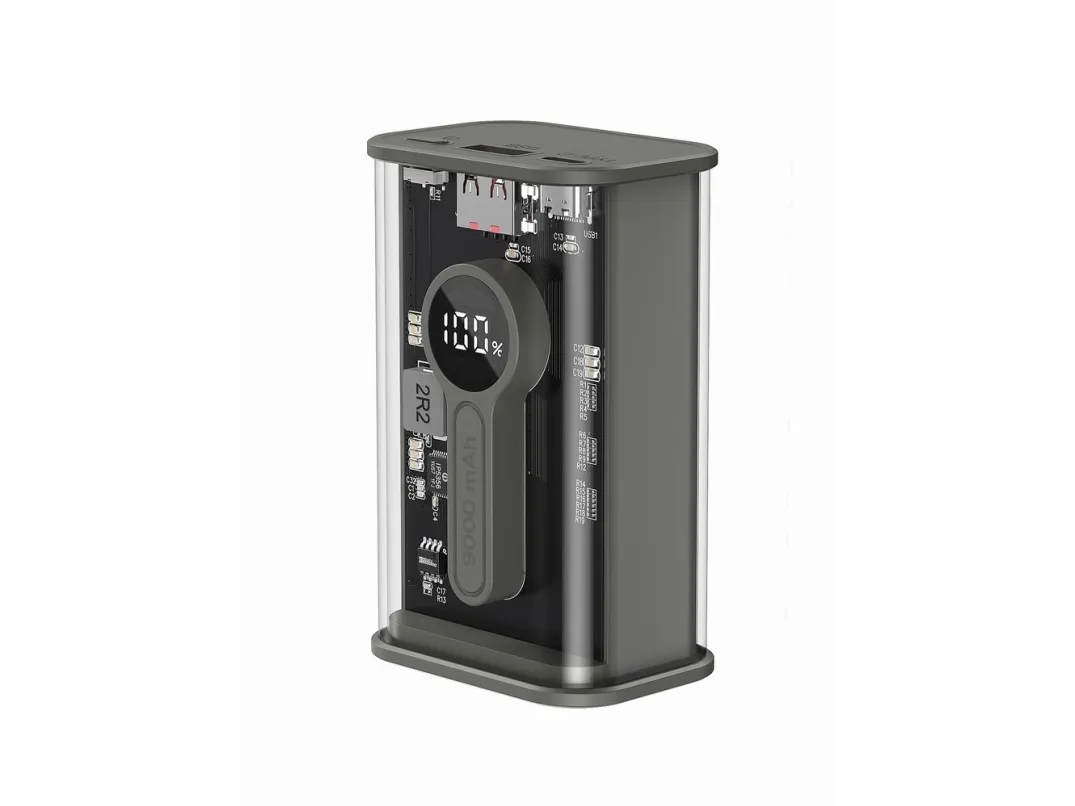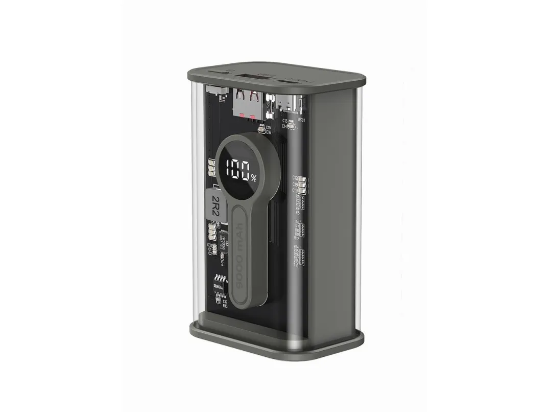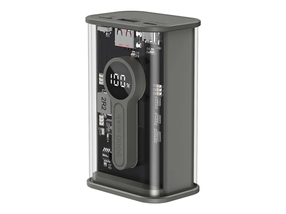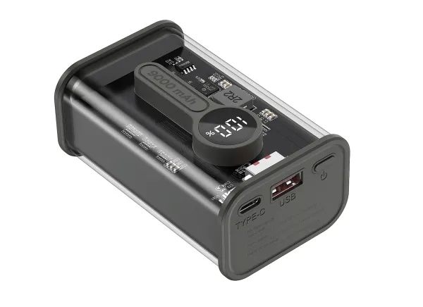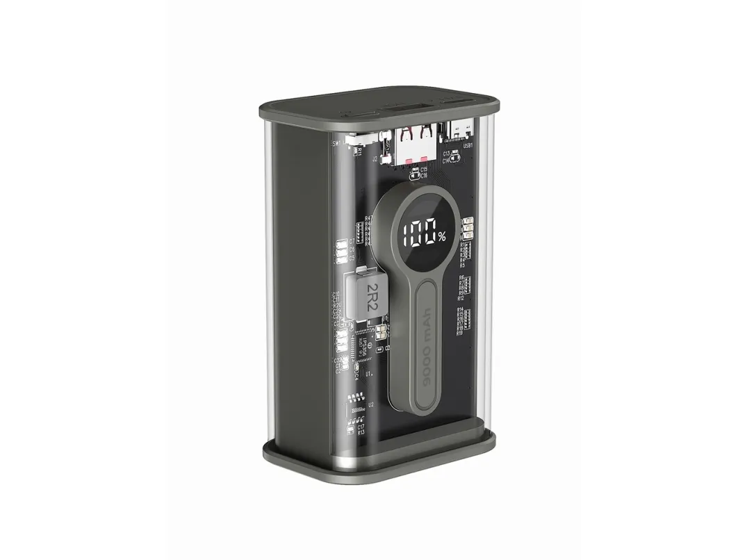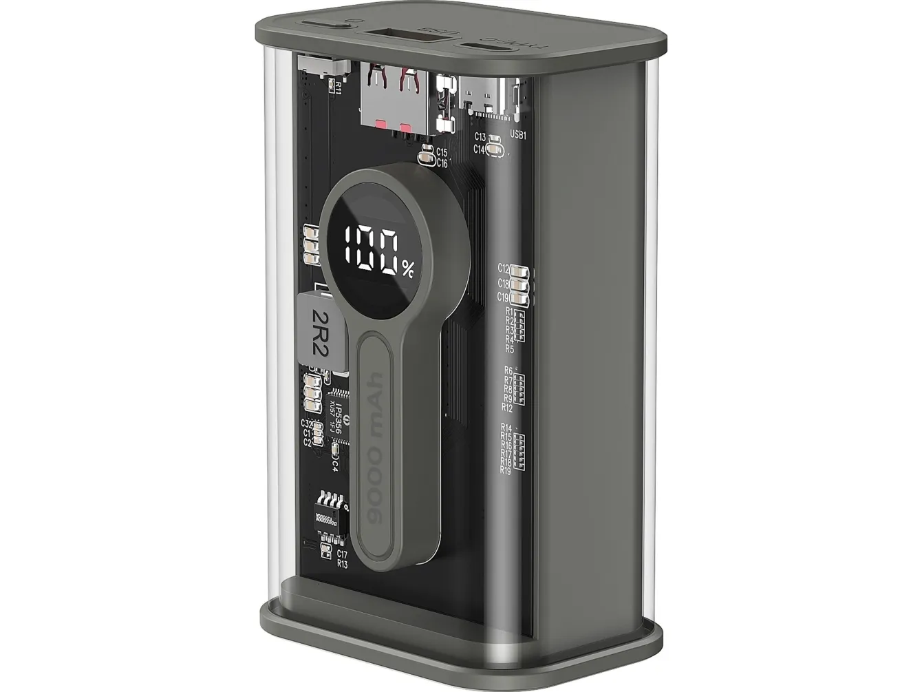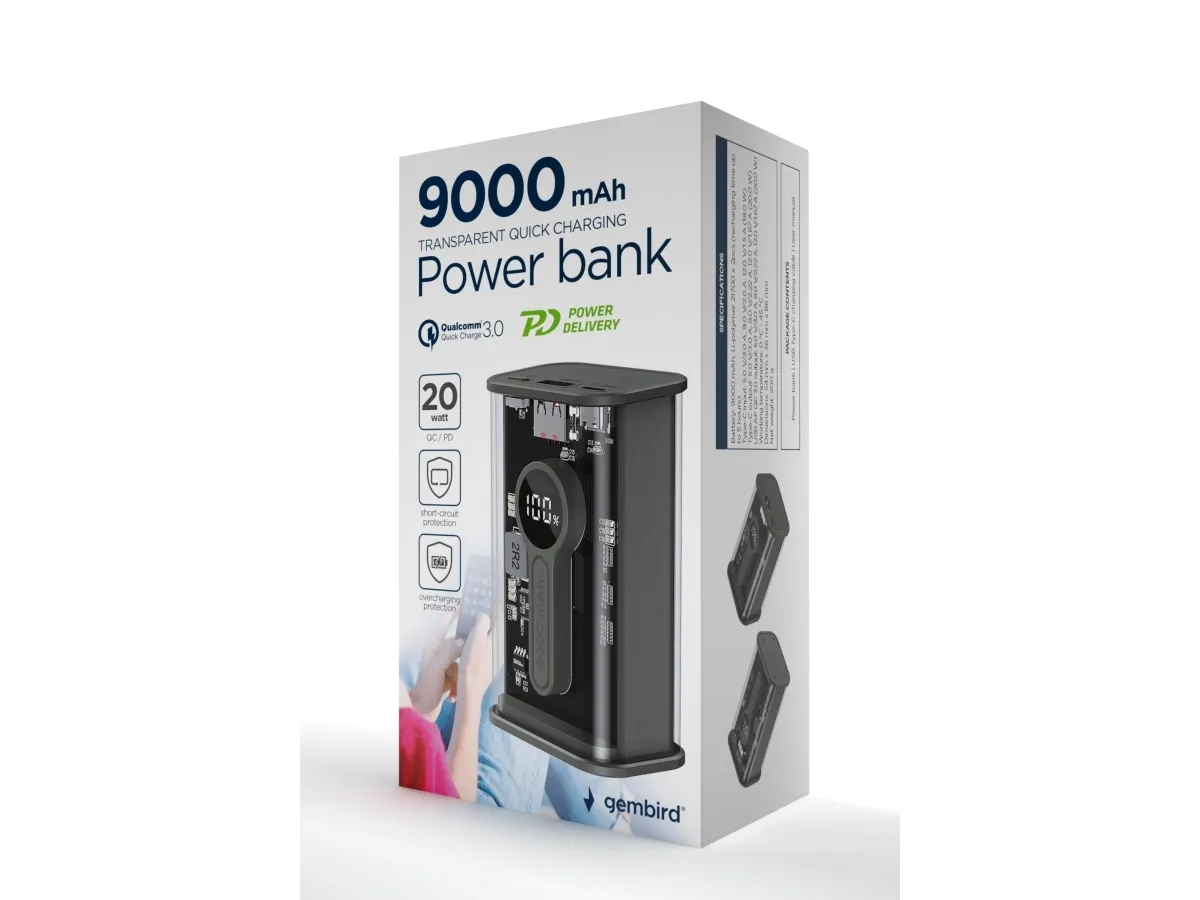 LCD battery status indicatorGembird PB09-TQC3-01. Battery capacity: 9000 mAh, Battery technology: Lithium Polymer (LiPo), Fast charging technology: Quick Charge 3.0. USB Type-A output ports: 1, USB Type-C ports quantity: 1. Total output power: 40 W, Output current: 3 A. Product colour: Black, Transparent