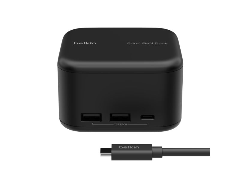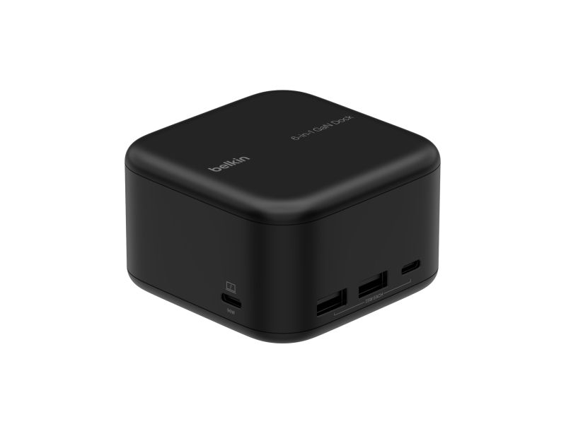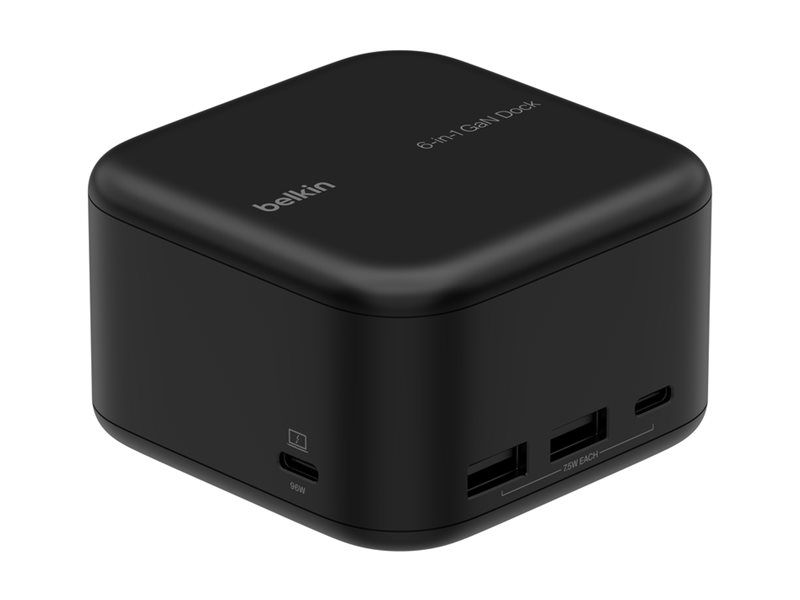 The Belkin CONNECT 6-in-1 Core GaN docking station is a comprehensive solution for expanding your device's connectivity. With its array of ports, including USB 3.2 and HDMI, it caters to a variety of needs, from charging to high-definition video output. The inclusion of Gallium Nitride (GaN) technology not only enhances efficiency but also ensures your devices are charged safely, thanks to its multiple protection features. Whether you're at home or in the office, this docking station is designed to boost your productivity by offering reliable, high-speed network connections through its Gigabit Ethernet port. Its compact form factor and the 90 cm USB-C cable provide flexibility in setup, making it an essential tool for anyone looking to enhance their workstation's capabilities.