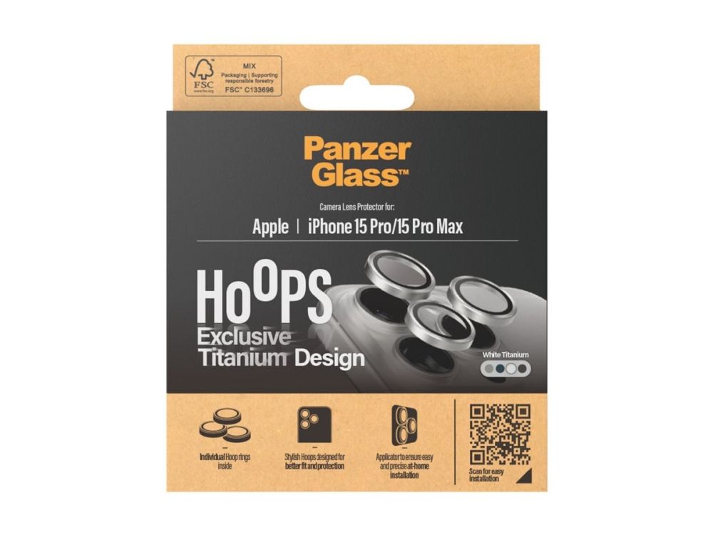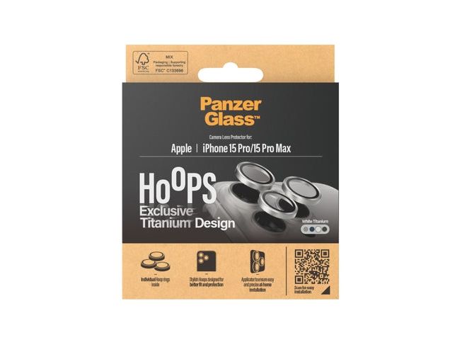 Equipped with tougher-than-tough ceramic glass and a beautiful titanium frame, this PanzerGlass Hoops camera lens protector protects your lenses, while looking great! Scratch-creating bumps, drops on stone-hard floors, and other hazards of everyday life are no match for these slim profile optic rings. There'll be no "Oops!" with Hoops ! And if you're worried about image distortion, rest easy: Hoops don't affect the clarity of your lenses or the quality of your photos – they just give you a bit more peace of mind. Hoops protect and prolong the lifetime of your phone so that one day you can pass it on to someone else who will love it just as much as you do. It's the new circle of phone life. By extending the lifespan of our devices, we postpone the need to produce new devices. This is one way of working toward a more sustainable future. Another is to use less packaging: In 2024, we reduced the amount of paper in our PanzerGlass core product packaging design by an average of 66 %*. So, of course, this product comes in a recyclable FSC-certified box. The optic rings are designed for easy application and perfect fit. They are equipped with a silicone adhesive along the edges and come with an easy-to-use applicator that makes installation a piece of cake (seriously!). And remember: Once installed, you'll never again fear your phone falling camera-first. This might not happen, but then again … it might! *Reduction from 2022-2024 measured by comparing selected products from the PanzerGlass core range.