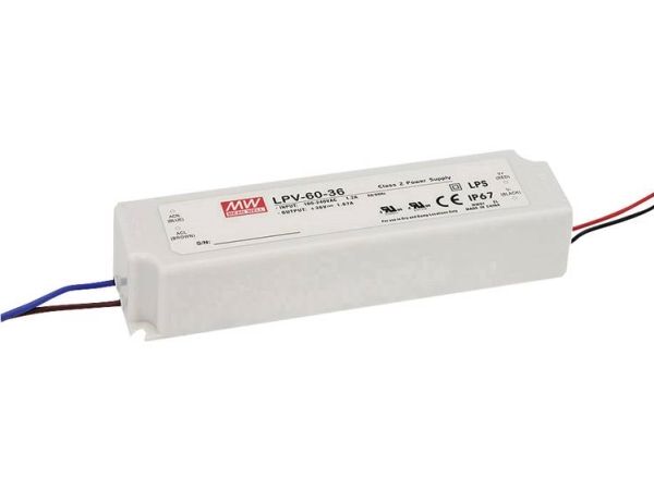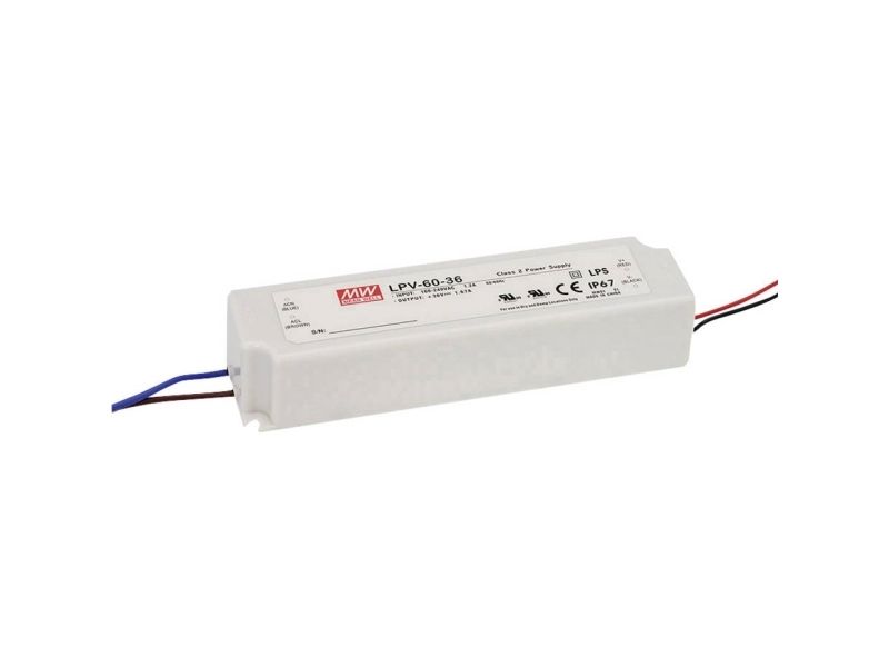 Brand- Mean Well. Model- LPV-60-24. Article- LPV-60-24. Input voltage- 90 - 264V. Output voltage- 24 - 24V. Max. system power- 60 W. Length- 162 mm. Width- 42 mm. Height- 32 mm. Weight- 400 g. Degree of protection (IP)- IP67. Mandatory warranty- 24 mo. Warranty for legal entities- 12 mo.