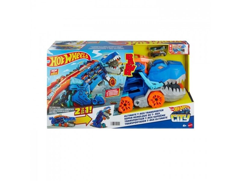 The Hot Wheels City Ultimate Hauler can gobble up and haul more than 20 1:64 scale cars and then transform into a growling, stomping T-Rex with a race track on its back! In hauler mode, pull it by the handle and watch it eat the 1:64 scale cars in its path. Lower the tail and it transforms into a Robo T-Rex with lights and sounds and a two-lane race track. Kids will recognize it from the Netflix series 'Let's Race' and can recreate their favourite scenes or invent new ones! Two 1:64 scale Hot Wheels cars are included. Colours and decorations may vary.Hot Wheels City Ultimate T-Rex Transporter, Hauler Transforms into a Dino, Featured in “Let’s Race”. Product type: Vehicle & track set, Recommended age (min): 4 yr(s), Recommended age (max): 5 yr(s). Battery type: AAA, Number of batteries supported: 3. Material: Plastic, Product colour: Multicolour