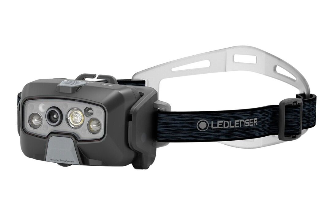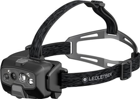 LEDLENSER oppladbar hodelykt med automatisk lysstyrkejustering hvitt og rødt frontlys opptil 1600 lumen IP68
