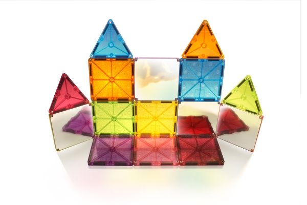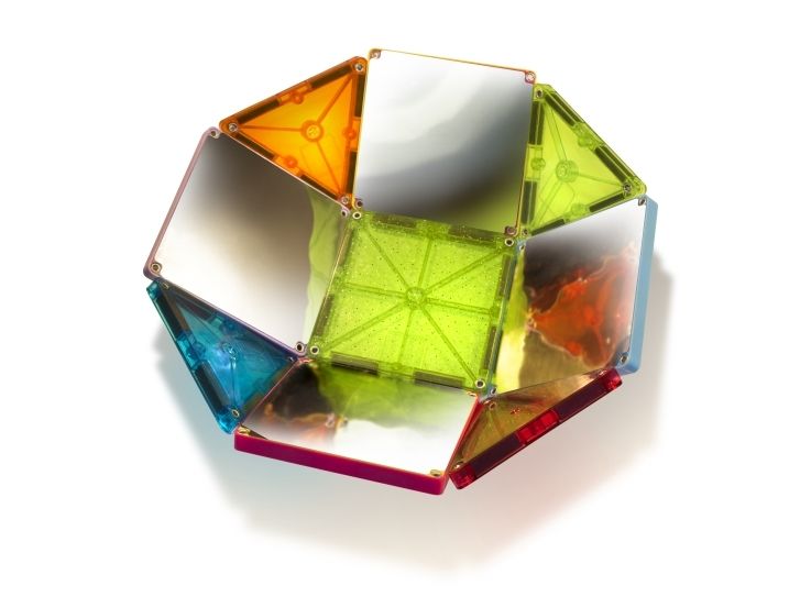MAGNA-TILES® sættene kommer i mange forskellige farver, former og temaer, så der kan både tilføjes spejle og dyr til byggeriet og legen.