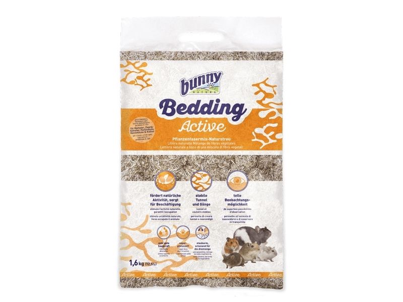 Bunny Natures råd om højde og skift af strøelse til dit kæledyr Hamster/Dværghamster: mindst 10 cm, skift ca. hver 4. uge. Ørkenrotte: mindst 30 cm, skift ca. hver 3. uge. Mus: mindst 10 cm, skift ca. hver 2. uge. Rotte: mindst 5 cm, skift ca. hver 2. uge. Steder beregnet til urin og ekskrementer skal fornyes hurtigt og regelmæssigt. Bedding Active er et naturligt produkt og kan bortskaffes miljøvenligt. Indhold: Linenfibre, halm-pellets, hjerteved af fyrretræ. Vægt: 1,6 kg / 12,5 L