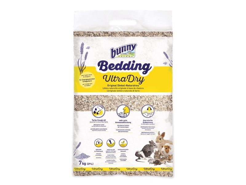 Bedding UltraDry er særligt absorberende og behageligt blødt/fleksibelt for poterne. Dets overflade forbliver tør i lang tid, hvilket gør det økonomisk at bruge. Dette fornybare materiale, spelt, fjerner permanent ammoniaklugt. Takket være sin termiske sterilisering er det perfekt for mennesker og dyr, der lider af allergier. Det er også det ideelle underlag for mange små dyr. Bunny Natures anbefalinger og skift af strø: Dværgkanin, marsvin og chinchilla: 5-8 cm Degu/Octodon, hamstere/dværghamstere, mus, rotter: 10-15 cm Ørkenrotte: 30 cm Skift cirka hver 2. uge for alle gnavere og hver 4. uge for gerbillers. Udskift områder med urin og afføring regelmæssigt. Strøet forbliver dermed friskt og tørt i længere tid, så dyret og dets ejer kan nyde en ren indhegning i længere tid. Bedding UltraDry er et naturligt produkt og kan bortskaffes miljøvenligt. Vægt: 7 kg / 29L