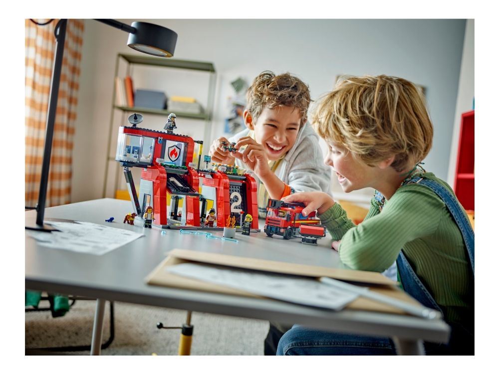 Brannstasjonssett med byggeveiledning i 3D – barn kan utforske LEGO® Builder appen, hvor de kan zoome og rotere modeller i 3D, spore framdriften sin og utforske og lagre virtuelle lekesett