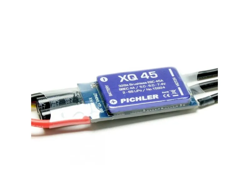 Brushless regulator XQ+ 45 til flymodeller 32 bit mikroprocessor Ekstremt fintfølende reguleringsadfærd Udsøgte, førsteklasses MOSFET-transistorer Kraftig, integreret BEC modtagerstrømforsyning Til alle gængse brushless-motorer (udvendig rotormotor eller indvendig rotormotor) 1000-dobbelt gennemprøvet kvalitetstilbehør (anbefaling) Programmerings boks, # 15966 Bluetooth-modul ESC, # 15932 Regulatoren er tilslutningsklart med 3 guldkontakter (motortilslutning) og XT stik til batteritilslutning. Kørsel er jævn for alle gængse masse af udenløbs- og indenløbsmotorer. Driften er også helt ukritisk i delbelastningsområdet.