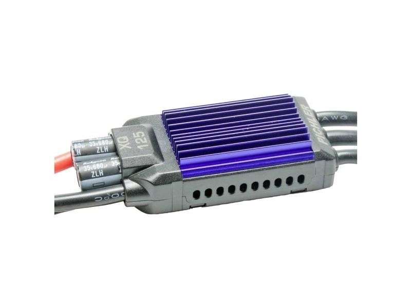 Brushless regulator XQ+ 125 til flymodeller 32 bit mikroprocessor Ekstremt fintfølende reguleringsadfærd Udsøgte, førsteklasses MOSFET-transistorer Kraftig, integreret BEC modtagerstrømforsyning Til alle gængse brushless-motorer (udvendig rotormotor eller indvendig rotormotor) Aktivt friløb/ensretter til impellerdrev 1000 gange velafprøvet topkvalitet Programmerings boks, # 15966 Bluetooth-modul ESC, # 15932 Regulatoren er klar til tilslutning og med 3 guldkontakter (motortilslutning) og XT90 til batteri-tilslutningen. Kørsel er jævn for alle gængse masse af udenløbs- og indenløbsmotorer. Driften er også helt ukritisk i delbelastningsområdet.