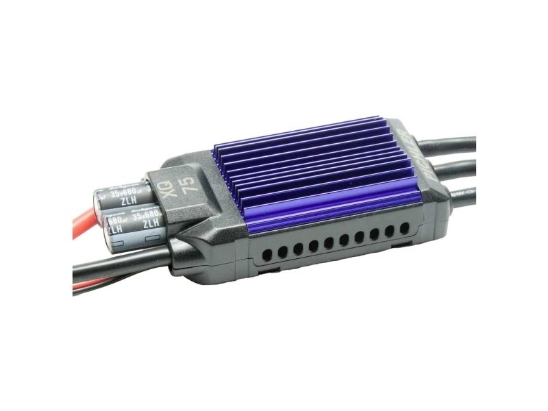 Brushless regulator XQ+ 75 til flymodeller 32 bit mikroprocessor Ekstremt fintfølende reguleringsadfærd Udsøgte, førsteklasses MOSFET-transistorer Kraftig, integreret BEC modtagerstrømforsyning Til alle gængse brushless-motorer (udvendig rotormotor eller indvendig rotormotor) Aktivt friløb/ensretter til impellerdrev 1000 gange velafprøvet topkvalitet Programmerings boks, # 15966 Bluetooth-modul ESC, # 15932 Regulatoren er klar til tilslutning og med 3 guldkontakter (motortilslutning) og XT90 til batteri-tilslutningen. Kørsel er jævn for alle gængse masse af udenløbs- og indenløbsmotorer. Driften er også helt ukritisk i delbelastningsområdet.
