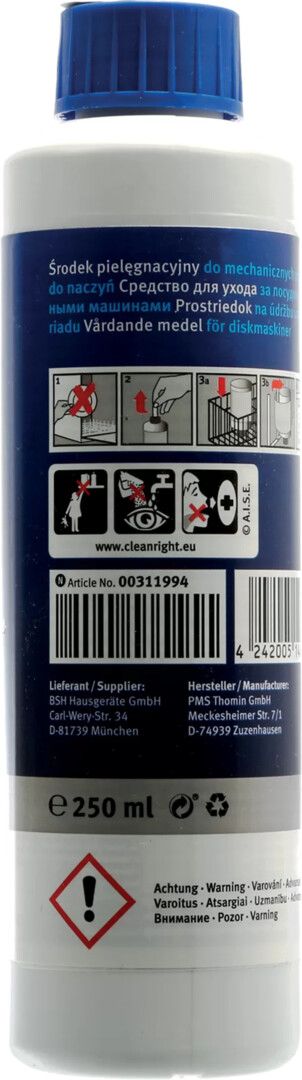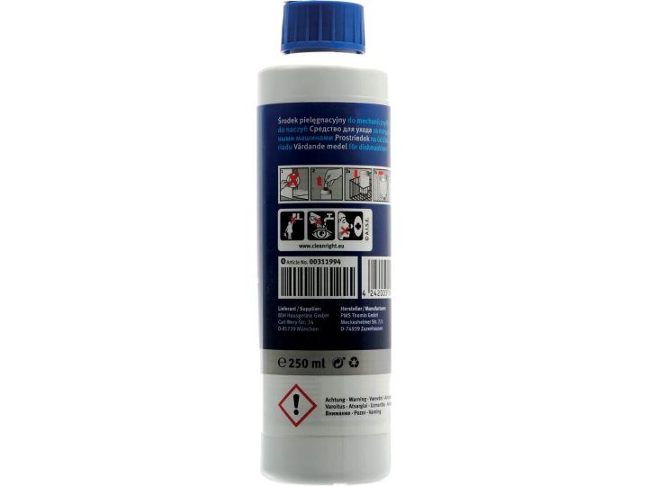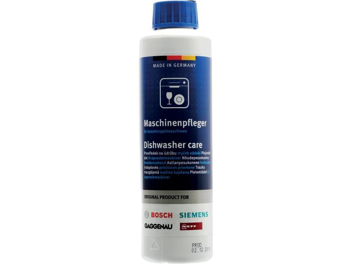 Dishwasher Care fra Bosch Siemens Hausgeräte er et oppvaskmiddel som egner seg til regelmessig rengjøring av oppvaskmaskinen. Rengjøringsproduktet fjerner fett og kalkavleiringer inne i oppvaskmaskinen og kan ved regelmessig bruk sikre gode oppvaskresultater og forlenge levetiden til oppvaskmaskinen. Ved regelmessig bruk anbefales det å bruke pleieproduktet en gang i måneden eller annenhver måned. Flasken inneholder 250 ml, noe som er nok til én behandling.