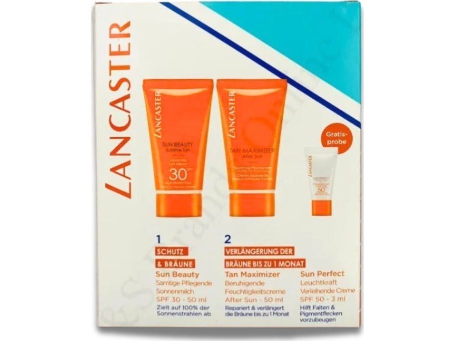 Lancaster Get The Golden Tan! Set : Golden Tan Maximizer, Buriti Oil, Anti-Wrinkle, After-Sun Serum, 3 ml + Golden Tan Maximizer, Hydrating And Soothing, After-Sun Lotion, 50 ml + Sun Beauty, UV Protection, Sunscreen Lotion, SPF 30, 50 ml Unisex