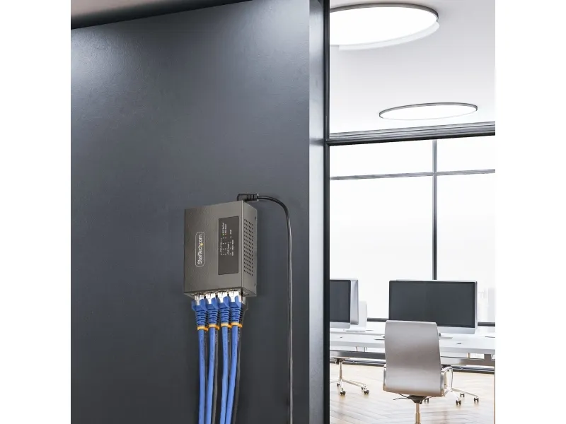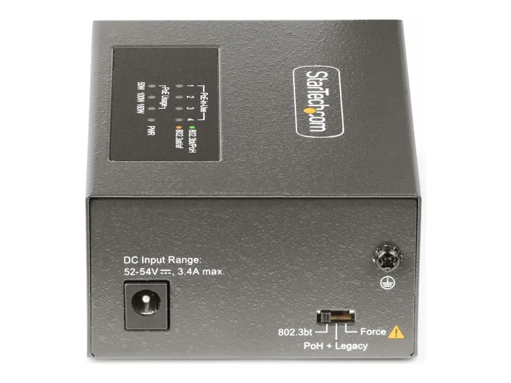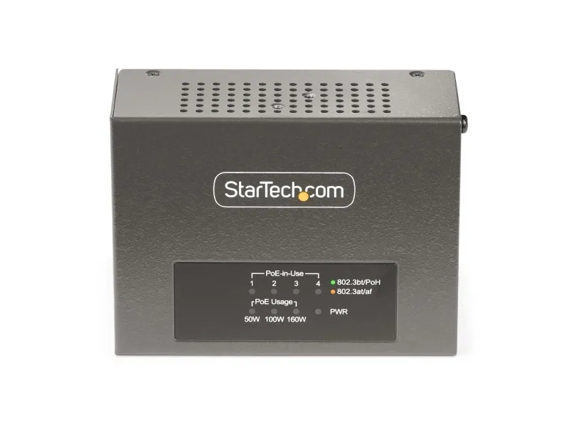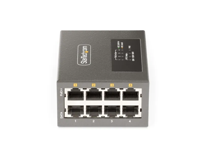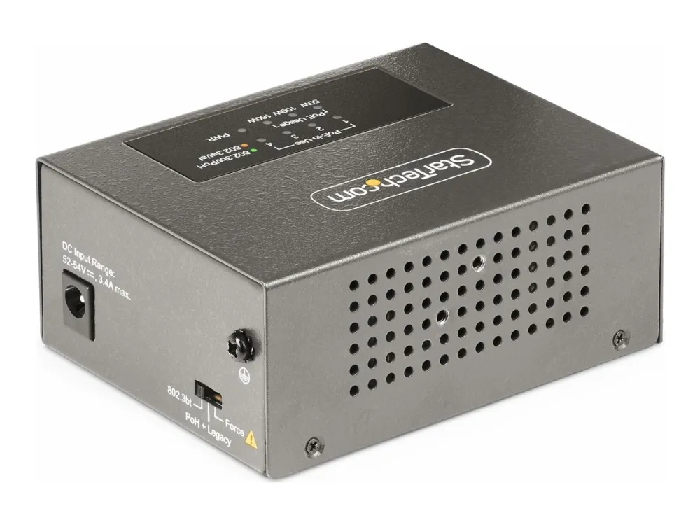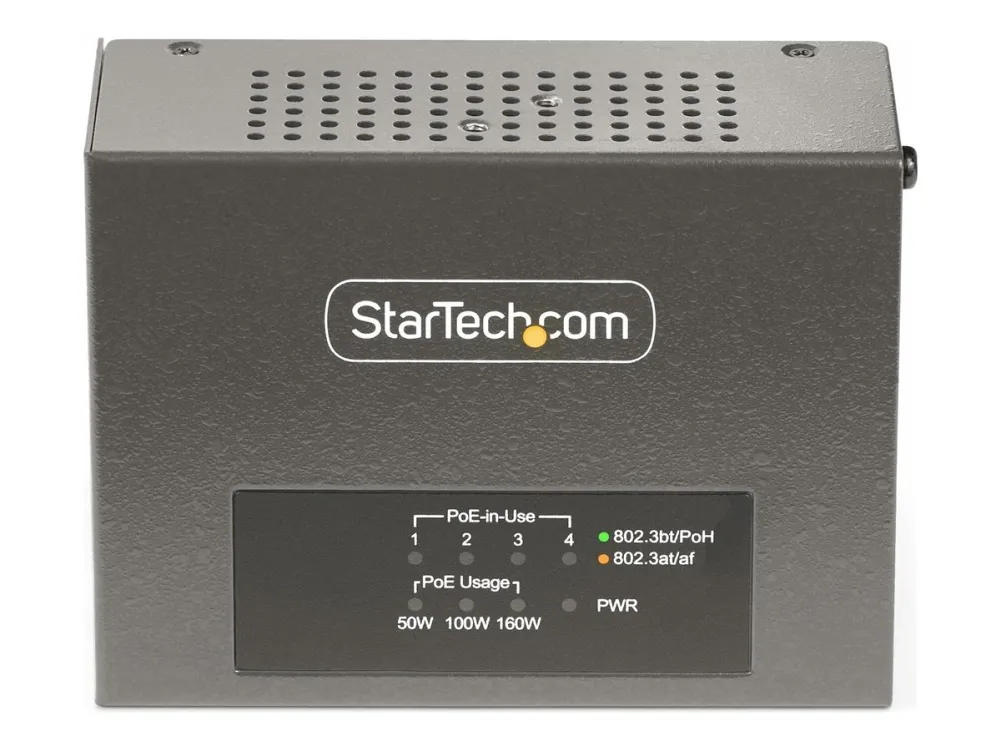 The StarTech.com 4-Port Multi-Gigabit PoE++ Injector efficiently delivers power and data over existing network cables, supporting robust network infrastructures. With four RJ-45 output connectors, this injector can provide up to 160 W of power across its ports, making it a choice for various PoE devices. Its rugged metal housing ensures durability while allowing for both DIN rail mounting and wall installation, offering versatile options to meet different setup needs. Engineered for reliability, this device operates in temperatures ranging from 0°C to 50°C and maintains a high humidity range of 5 - 95% RH (non-condensing). Its wake on LAN functionality, combined with features such as auto MDIX support and 8 kV ESD protection for contact, enhances operational efficiency and device longevity. This PoE injector is compliant with several important standards, ensuring it meets industry requirements for safe and effective power delivery.