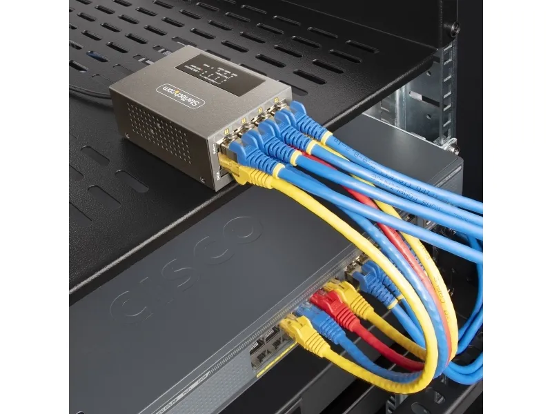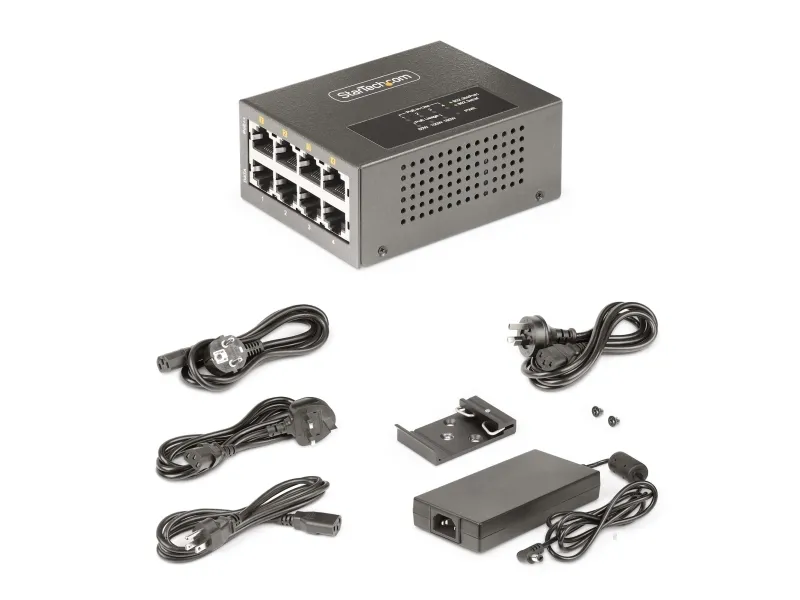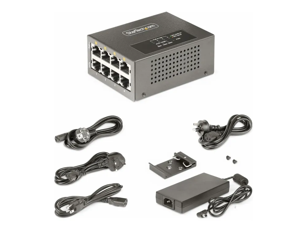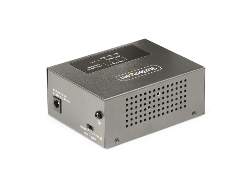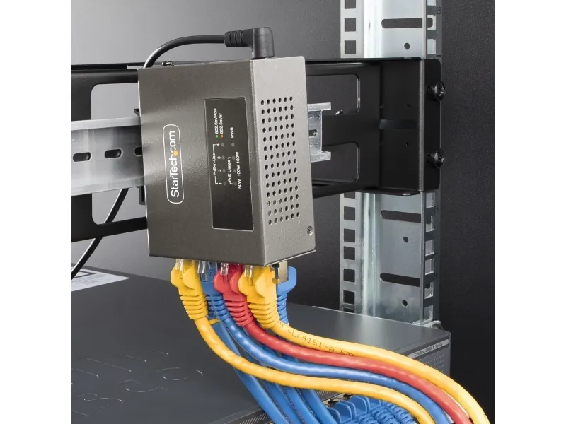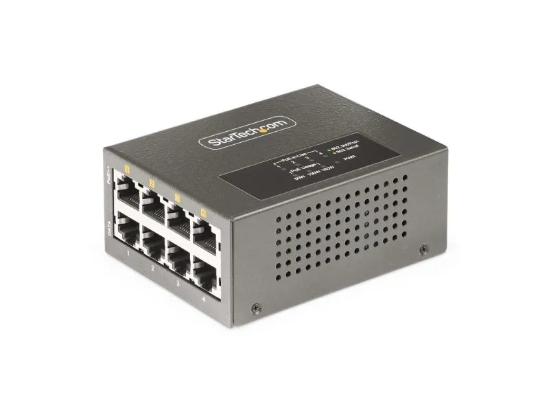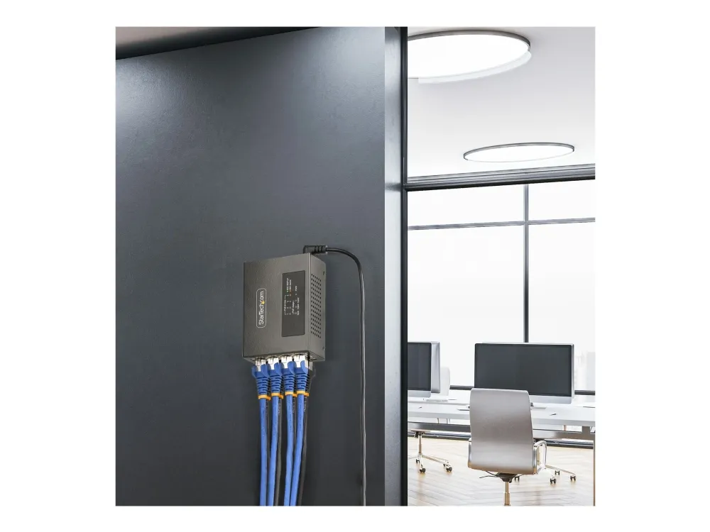 The StarTech.com 4-Port Multi-Gigabit PoE++ Injector efficiently delivers power and data over existing network cables, supporting robust network infrastructures. With four RJ-45 output connectors, this injector can provide up to 160 W of power across its ports, making it a choice for various PoE devices. Its rugged metal housing ensures durability while allowing for both DIN rail mounting and wall installation, offering versatile options to meet different setup needs. Engineered for reliability, this device operates in temperatures ranging from 0°C to 50°C and maintains a high humidity range of 5 - 95% RH (non-condensing). Its wake on LAN functionality, combined with features such as auto MDIX support and 8 kV ESD protection for contact, enhances operational efficiency and device longevity. This PoE injector is compliant with several important standards, ensuring it meets industry requirements for safe and effective power delivery.