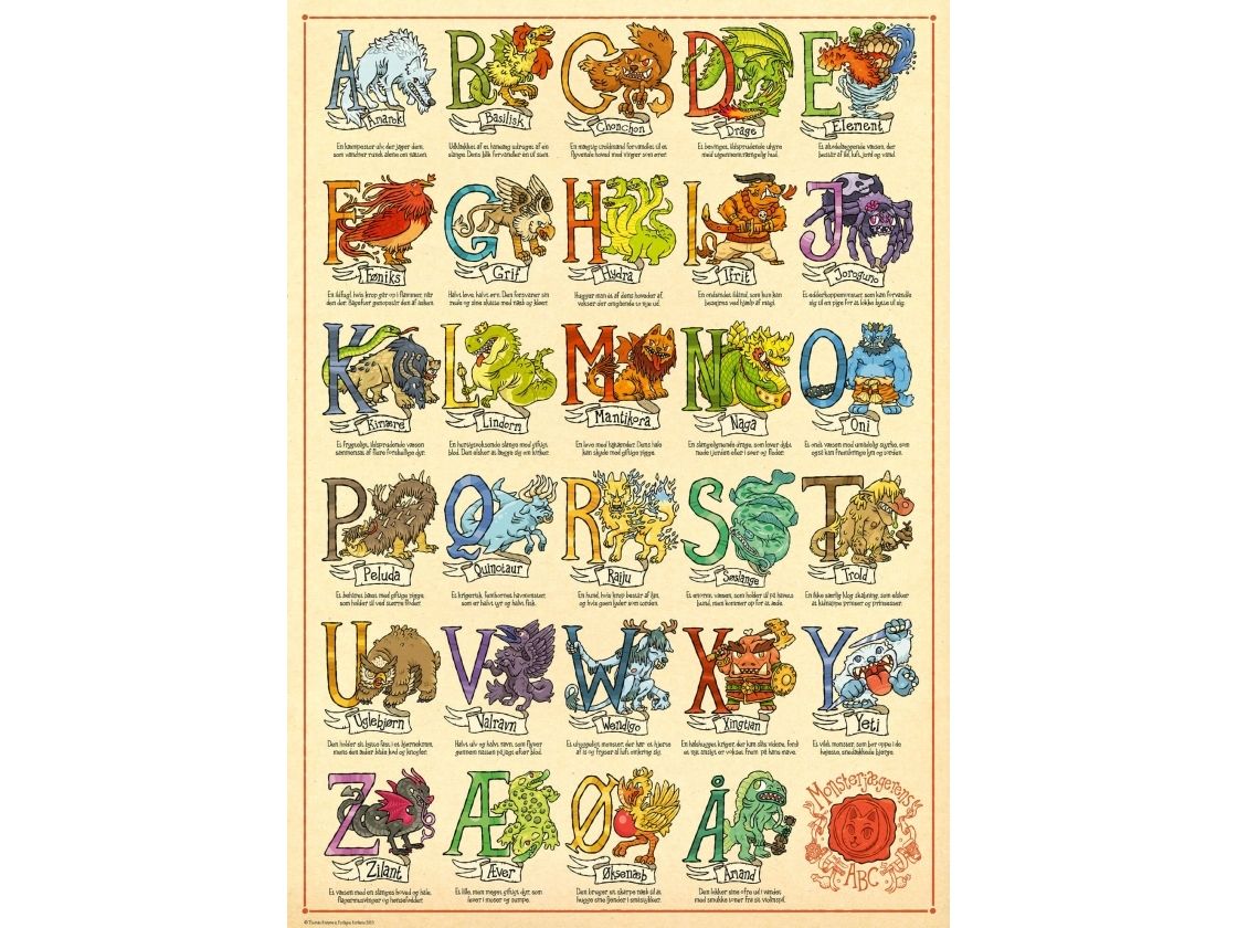 ABC-plakat med 29 forskellige monstre fra Thomas Knappes børnevenlige fantasy-univers i vælgebogen “Hvordan vil du jage et monster?”. Plakaten måler 50*70 cm.