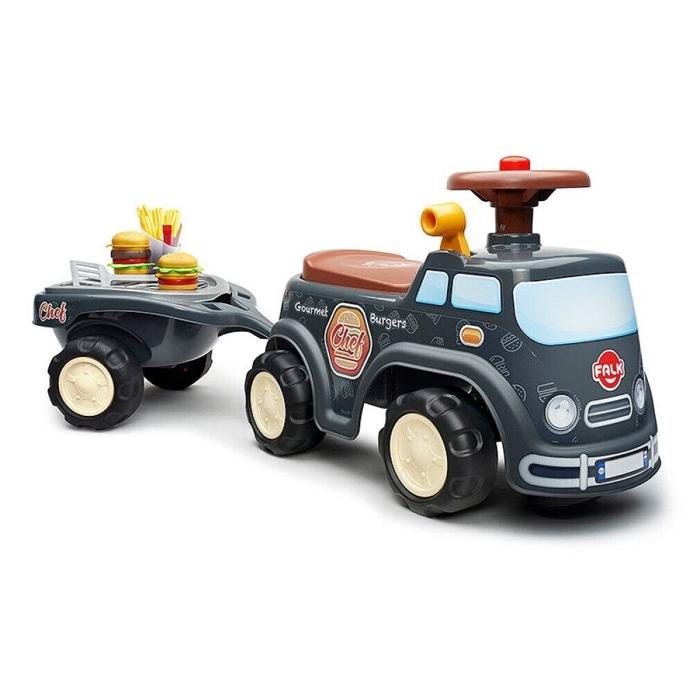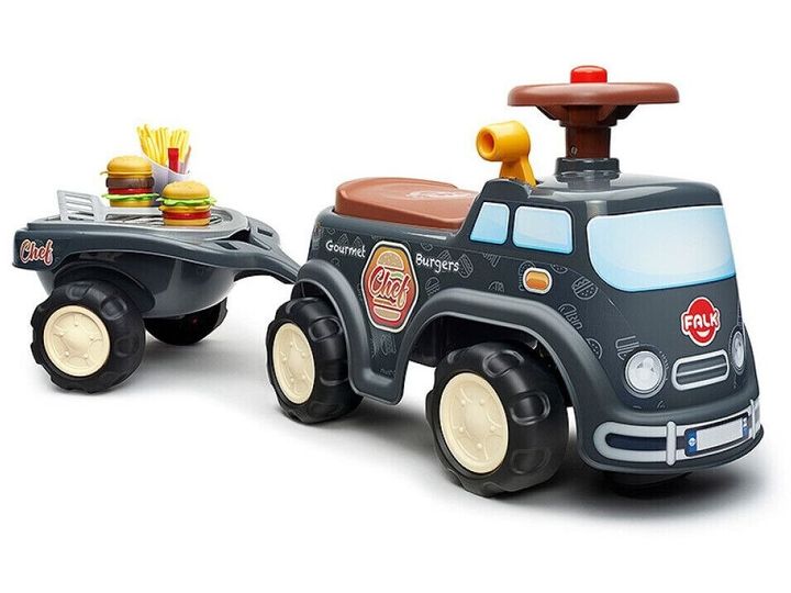 Rygtet spreder sig rundt i byen om, at de bedste burgere i øjeblikket kommer fra den nye "Chef" Food Truck! Den er lavet i Frankrig og har alle koder for en ægte Food Truck med sit retro og urbane look, dens trailer udstyret med en grill og 2 burgere til at sammensætte efter dine ønsker. Vegetarisk eller traditionel, der er noget for enhver smag! Super nem at håndtere takket være dets retningsbestemte rat med horn, og med fremragende stabilitet, er denne bærer ideel til at udvikle dit barns motorik og balance gennem leg, samtidig med at den garanterer barnets sikkerhed. Men det er ikke alt! En lille opbevaringsboks er skjult under sædet, og en brugerdefinerbar nummerplade giver dig mulighed for at personliggøre din yndlingsbil!