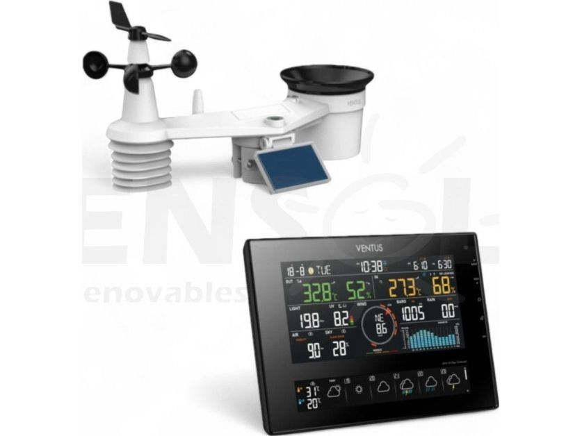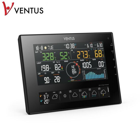 Stort flot og tydeligt farve display med angivelse af 10 dages vejrudsigt, temperatur og luftfugtighed inde og udendørs, lufttryk, sol og måne op og nedgang, vindhastighed og retning, chill faktor, heat indeks, regn per time, dag, uge, måned og total. UV indeks, lysintensivitet med mere. vejrinformationer kommer fra den udendørs 7 i 1 sensor med stort vipbart solar panel eller fra PWL platformen, hvor du kan se real time lokale vejrudsigter, hente dine vejrinformationer. Vejrstationer supporterer op til 7 ekstra sensorer, såsom jord sensor, pool sensor og temperatur / luftfugtigheds sensorer.