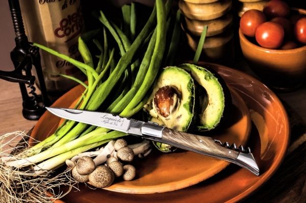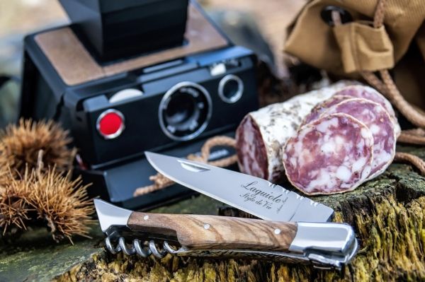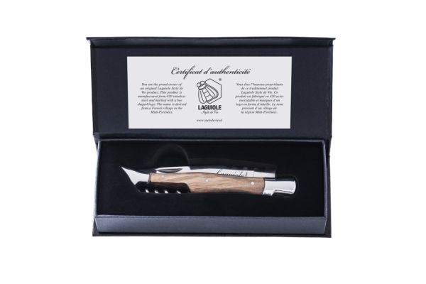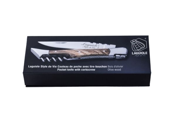 Lommekniven i oliventræ med proptrækker fra Laguiole Style de Vie gør det nemt at åbne en flaske vin. Lommeknivens glatte blad er lavet af rustfrit stål og er færdigbehandlet med den autentiske Laguiole-bi. Hver lommekniv er pakket i en luksuriøs gaveæske.
