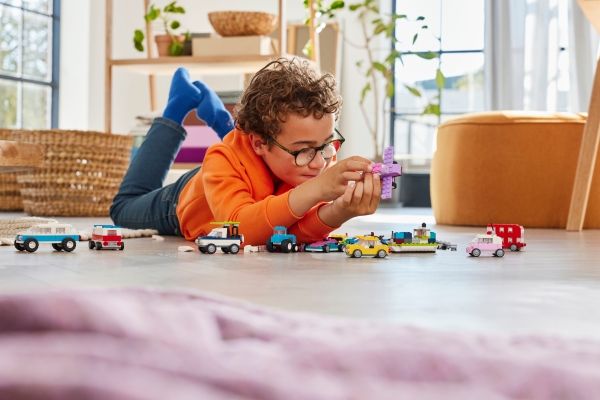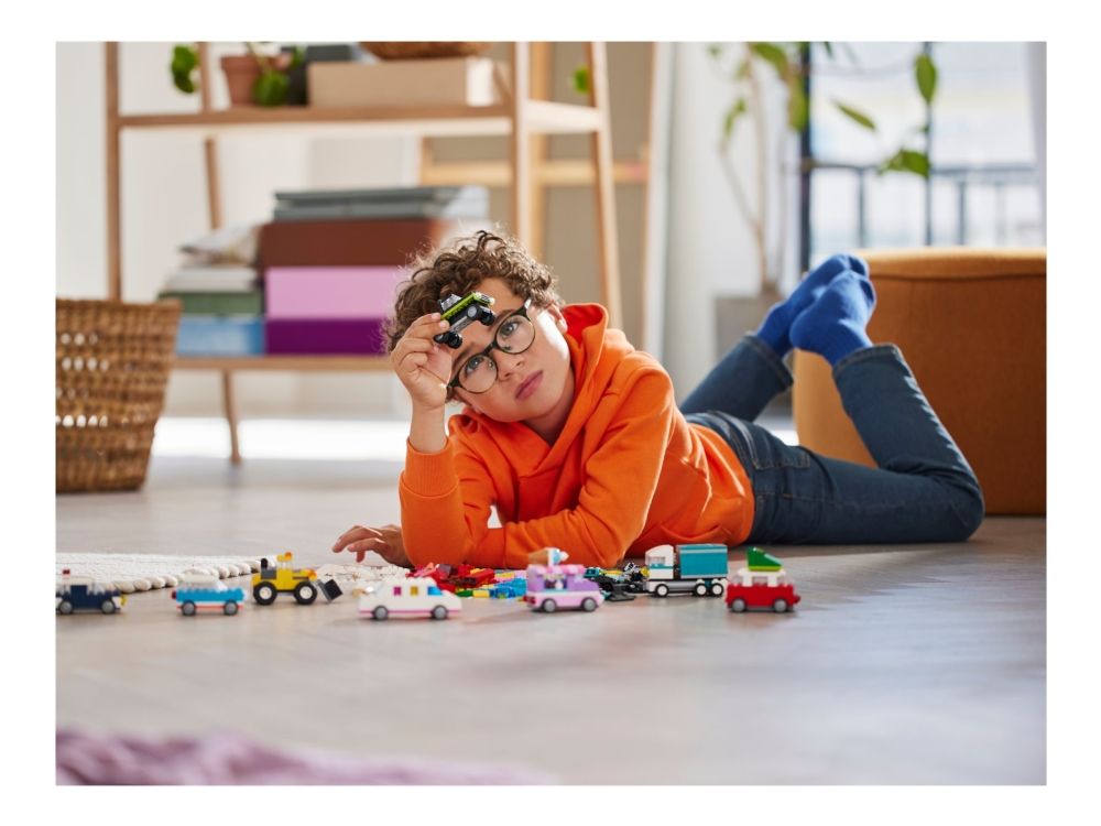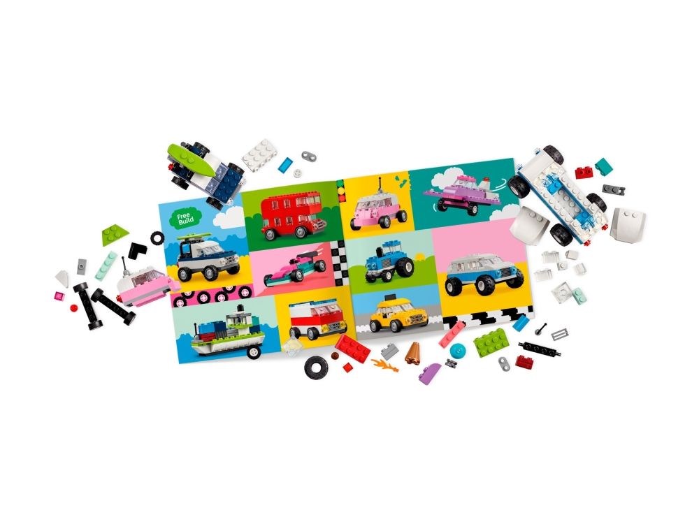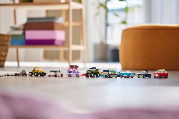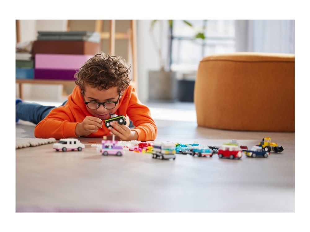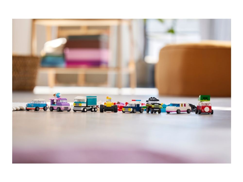 Med 900 byggeklosser, spesielle deler og 52 hjul samt enkle instruksjoner kan barn bygge en politibil, en isbil, en ATV, en frontlaster, en lastebil, en stasjonsvogn, et terrengkjøretøy og en limousin til lek. Deretter får barnet inspirasjon til forskjellige designer, kule detaljer og fargerike dekorasjoner for å bygge om kjøretøyene på nye, gøyale måter. Når barna utvikler mer kreative byggeferdigheter, kan de prøve ut sine egne designer. Det følger med ti fantasifulle ideer som kickstarter den kreative moroa. De finner også instruksjoner i LEGO Builder appen, som lar barna zoome inn, rotere modellene og spore fremgangen sin.