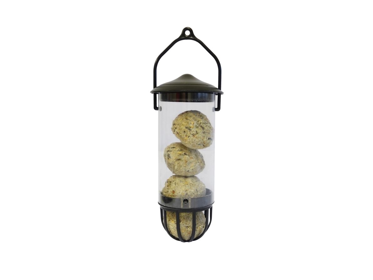 Upplev vinterns småfåglar med denna talgbollshållare. Den håller fast talgbollarna så att de inte ramlar ut samtidigt som större fåglar inte kan flyga iväg med maten. Vid påfyllning lyfter man bara locket och lägger i talgbollar.