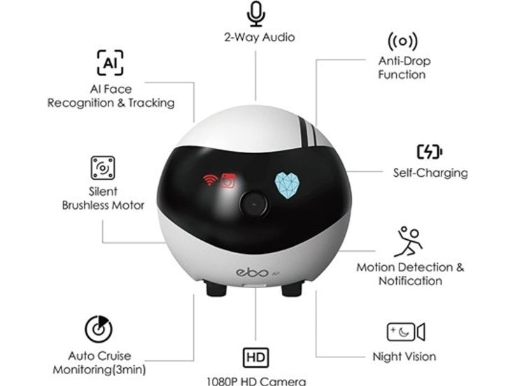 Enabot EBO Air. Product type: Robot, Voice control, Wi-Fi. Batteries required, Battery capacity: 2500 mAh. Height: 89.2 mm