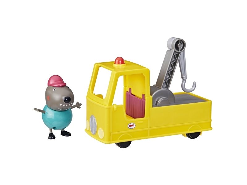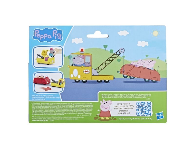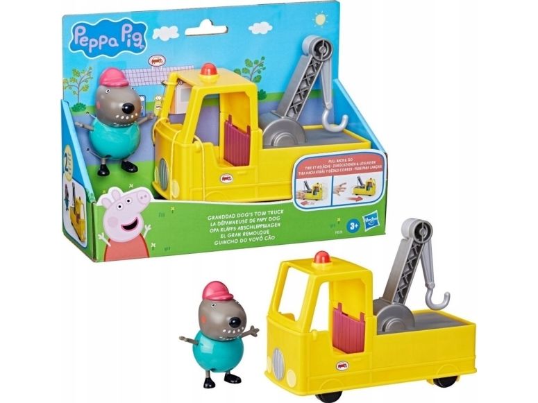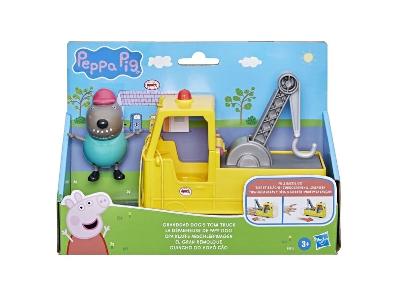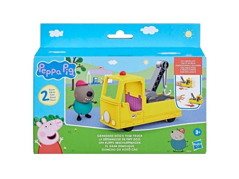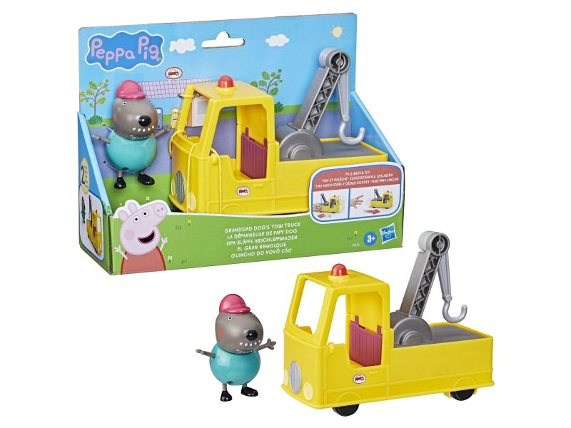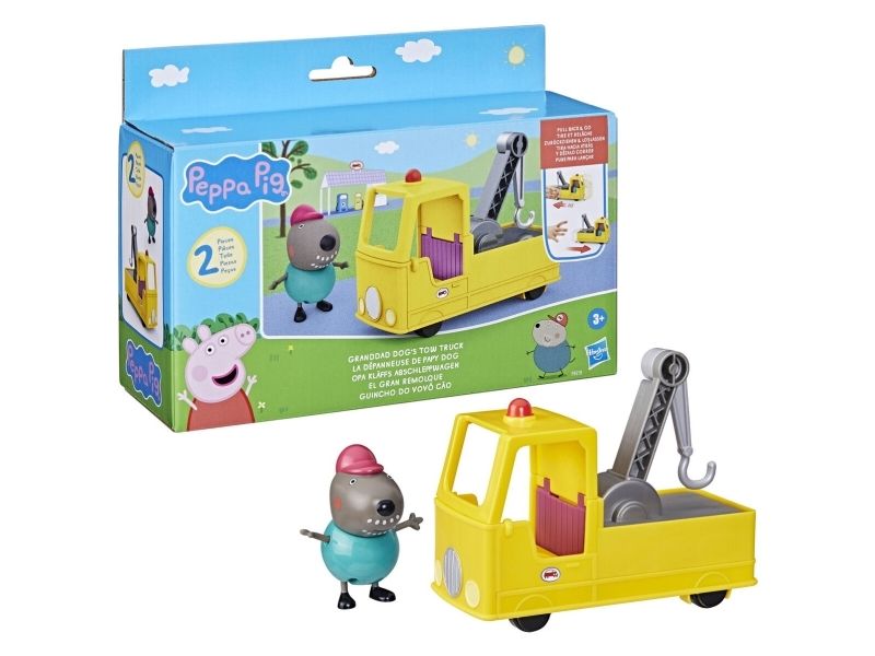 Å, nei, har bilen fått problemer? Ikke bekymre deg – Bestefar Hunds tauebil er her! Dette Peppa Gris-settet leveres med en tauebilleke som trekkes tilbake – bare rull den bakover og se den kjøre! Bestefar Hund-figuren passer i førerhuset, og det hengslede taket gjør det enkelt for små hender å få figuren inn og ut. Den flyttbare tauekroken lar barna forestille seg scener fra serien, eller de kan finne opp sine egne nye eventyr! Peppa-leker som Bestefar Hunds tauebil er basert på Peppa Gris-favorittkarakterer og er flotte gaver til gutter og jenter fra 3 år, eller barn som elsker anleggsleker eller lekekjøretøy. © 2023 ABD Ltd/Ent. One UK Ltd. Hasbro og alle tilknyttede begreper er varemerker som tilhører Hasbro.