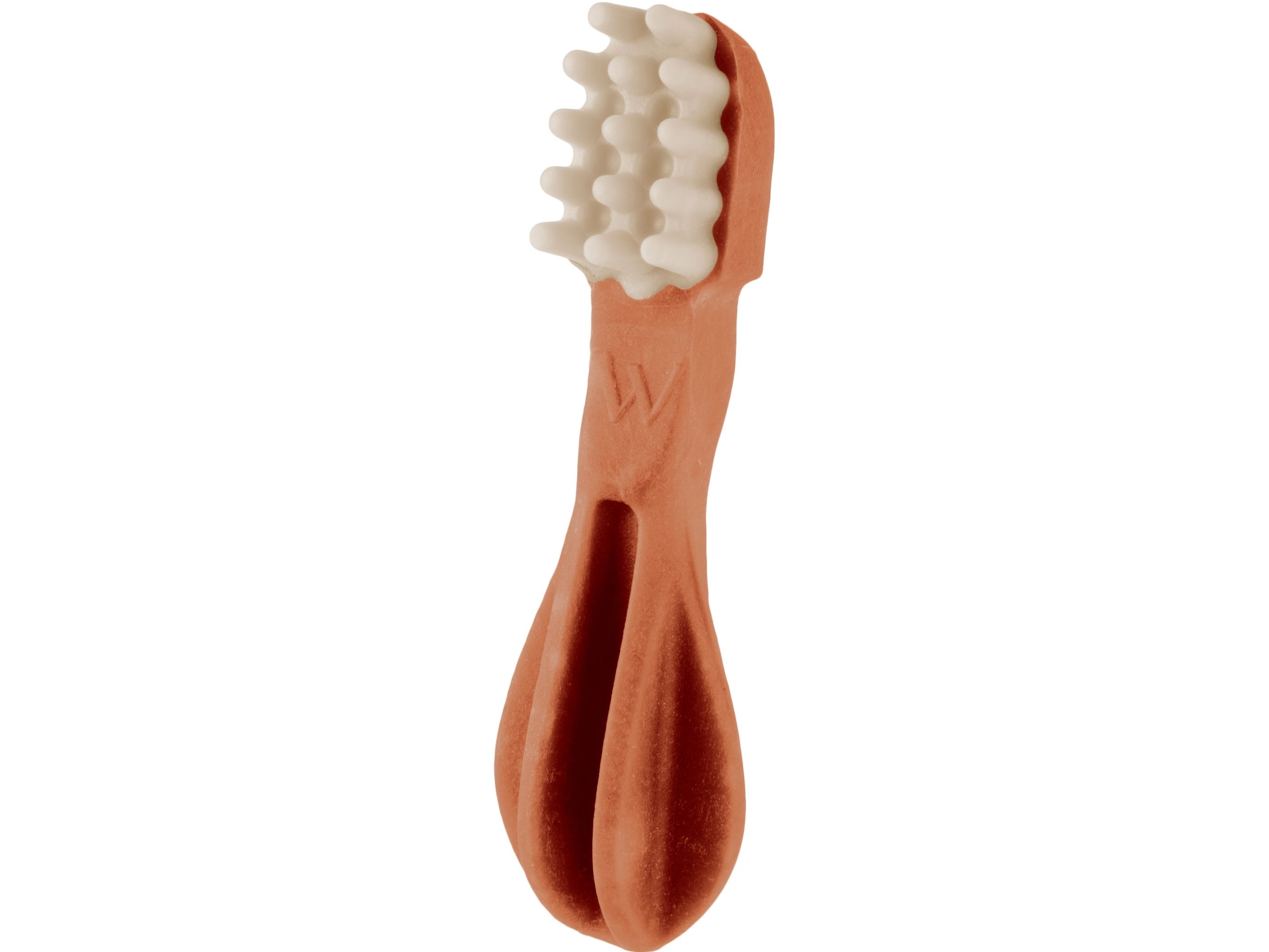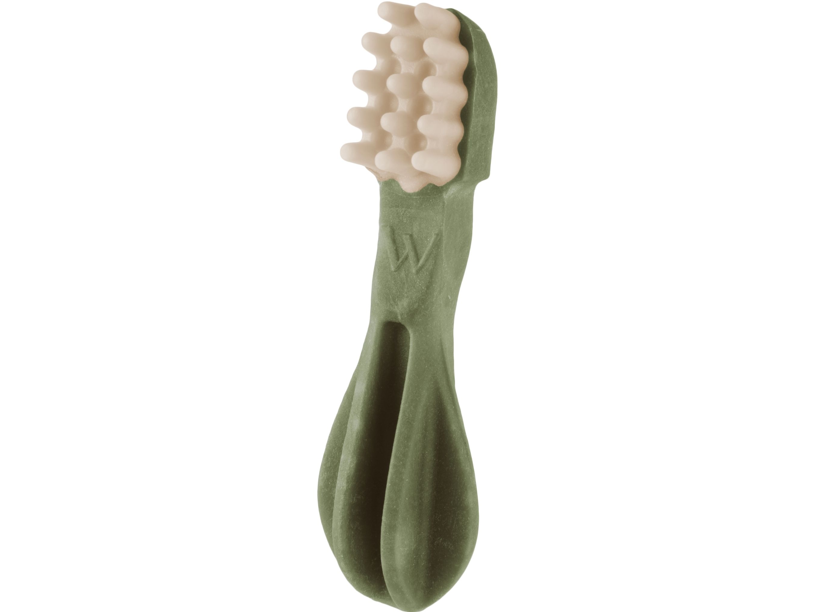 Den spiselige, vegetariske og kornfrie tandtyggeben udgør et sundt alternativ for hunde med følsomhed over for foder. Udformningen fremmer en sund blodcirkulation i tandkødet, forhindrer dårlig ånde og hindrer ophobning af tandsten. Børsteformen og mellemrummene i designet muliggør nem tygning, samtidig med at der renses i de mindre mellemrum. Produktet er produceret bæredygtigt uden kunstige ingredienser, farvestoffer, smagsstoffer, konserveringsmidler, GMO'er, gluten eller kød.