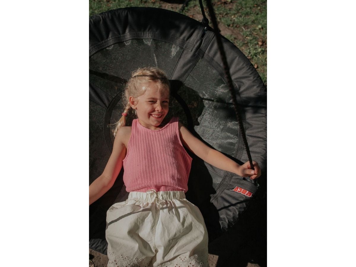 The swing can be used both indoors and outdoors and is for 2 point mounting. The swing is, however, not approved for institutions. Max weight: 100 kg. Material: 100% nylon. Size: 70 cm.