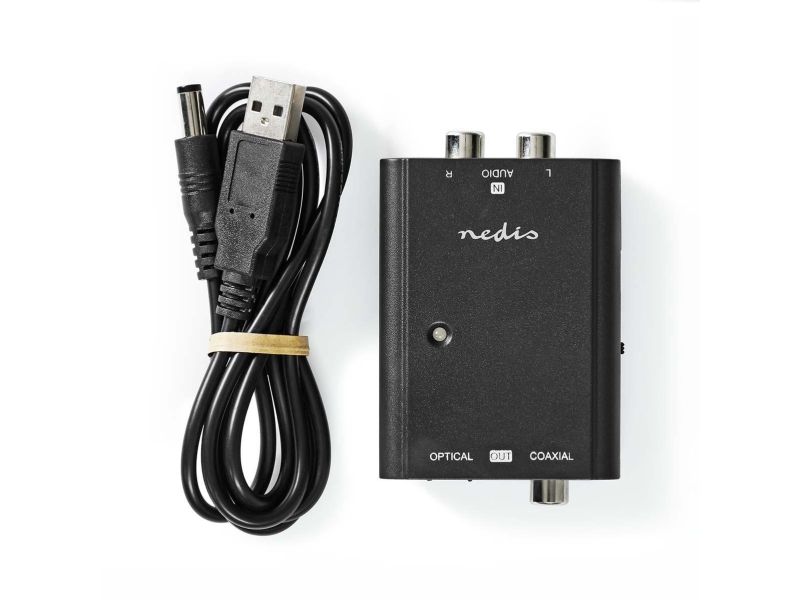 This analog to digital audio (ADC) converter is suitable to convert an analog audio signal to a digital audio signal. Thanks to this converter you can connect a device with analog Tulp stereo 2x RCA output to an amplifier / receiver with optical Toslink or coaxial RCA (S/P-DIF) input.