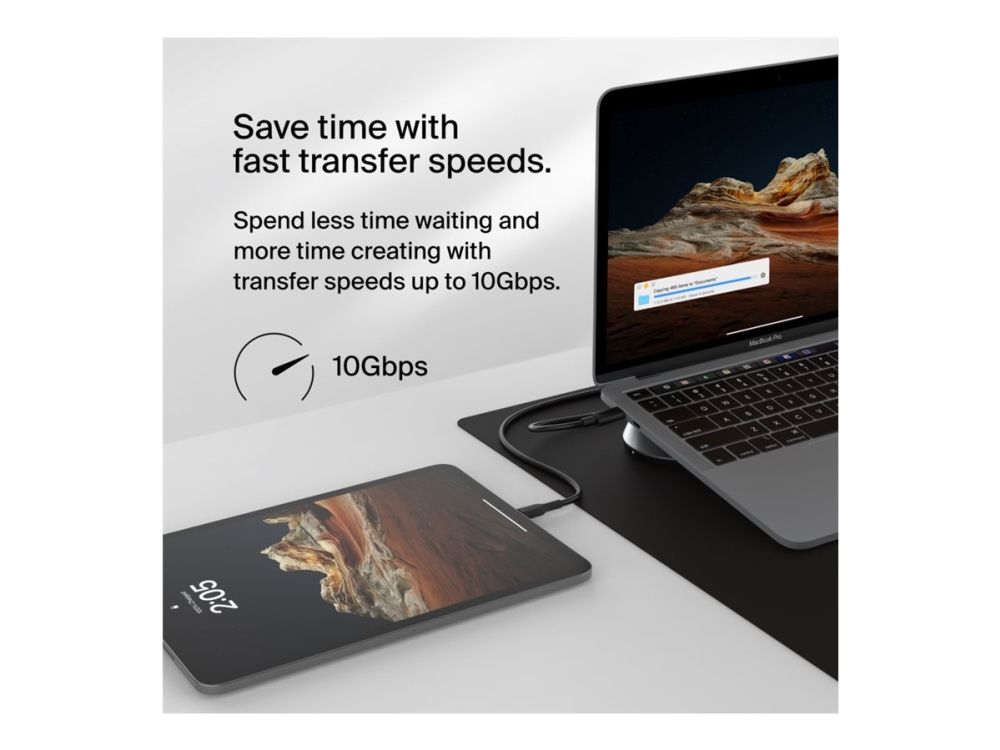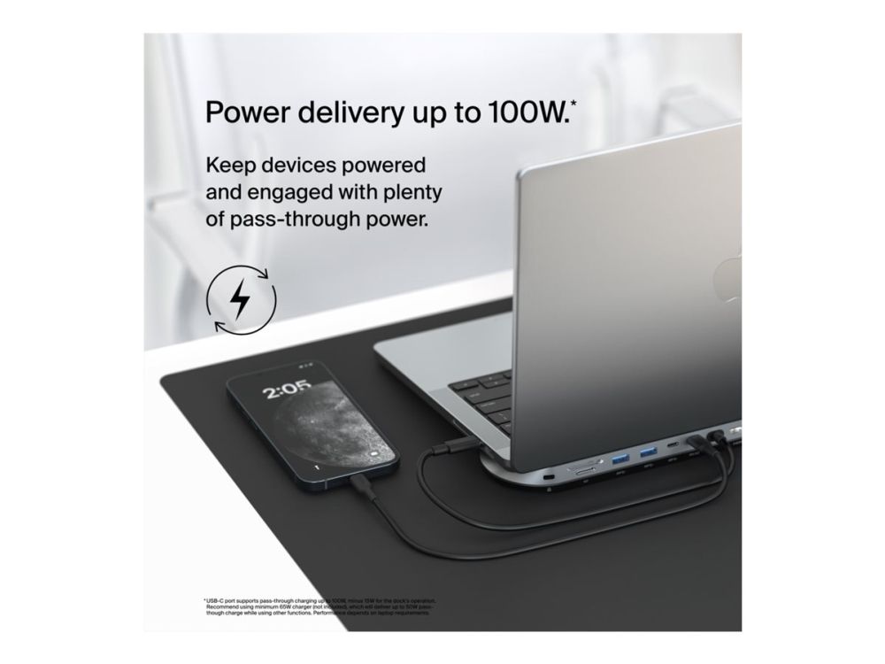 Silicon Motion-teknologi, støtte for inntil 3 skjermer, 100 W-effektlevering (gjennomløp), opptil 10 Gbps dataoverføring, funksjon for bærbarstativ, 72 % resirkulert materiale etter forbruk, sikkerhetslåsspor (kabellås solgt separat), Post-consumer Recycled Plastic