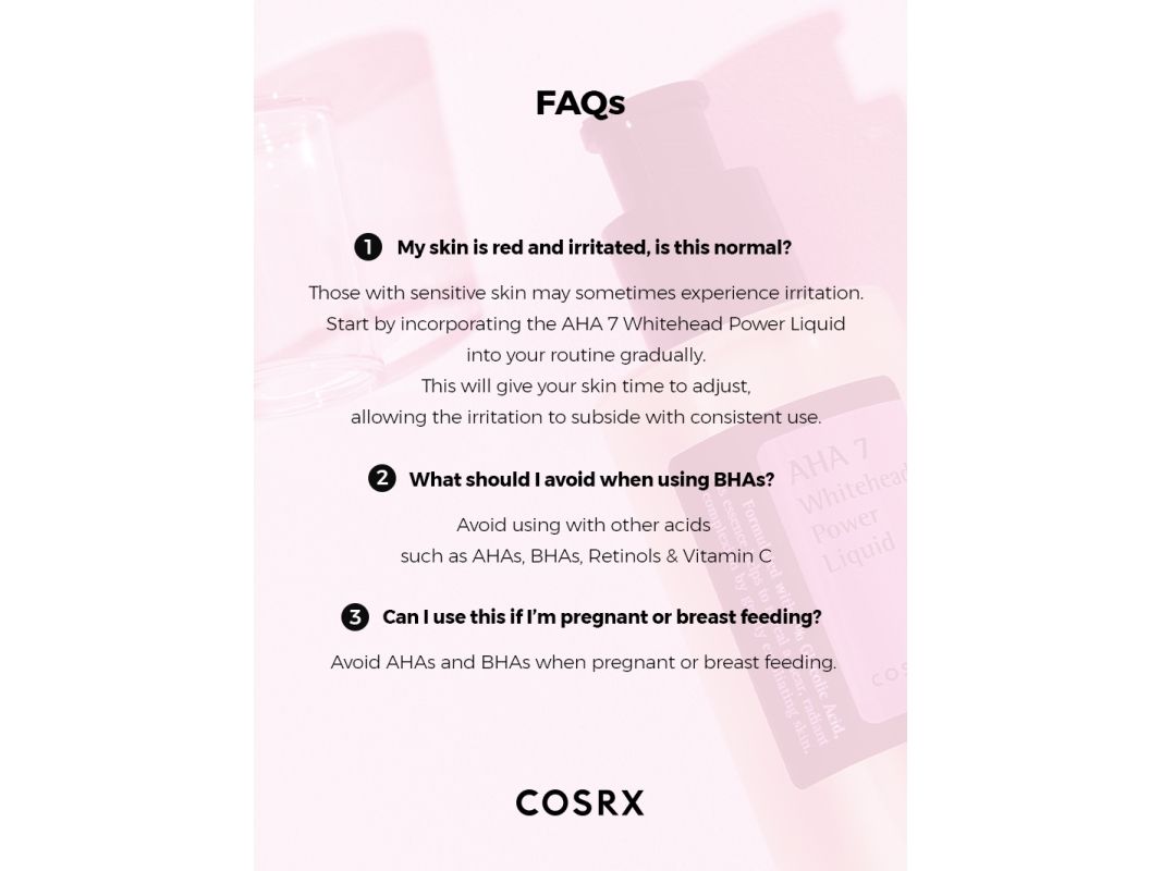 Eksfoliering med AHA 7 Whitehead Power Liquid er desuden en effektiv hjælp til både bumser, ujævn hud og små, hvide knopper (whiteheads), da den går ind og bekæmper bakterierne og fjerner overskydende døde hudceller i de øverste hudlag. AHA-syrer forbedrer hudens struktur og vil give dig en blødere og mere ungdommelig hud og udstråling.