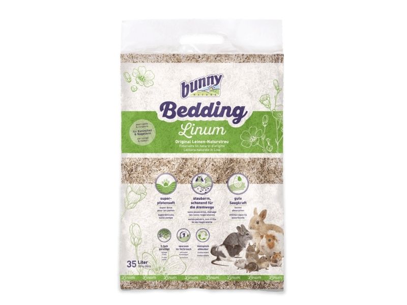 Naturligt bundstrøelse lavet af hør til kaniner, marsvin og andre gnavere Bunny Nature Bedding Linum er et naturligt bundstrøelse lavet af hør. Det giver dine kæledyr maksimal komfort og giver dem en tør og behagelig overflade at ligge og bevæge sig på. Mængden, du skal bruge, afhænger af burets størrelse og antallet af dyr. Vejledning i brug af Bunny Nature Bedding Linum strøelse til kæledyr : Et løst lag på 5-8 cm Bedding Linum. Udskift det materiale, der er tilsmudset med urin og afføring, med nyt Bedding Linum. Bunny Nature Bedding Linum forbliver tørt i omkring 14 dage, afhængigt af burets størrelse og antallet af dyr, og produktet er fremragende til at binde ammoniak. Bunny Nature Bedding Linum e r et naturligt produkt og kan bortskaffes på en miljøvenlig måde.
