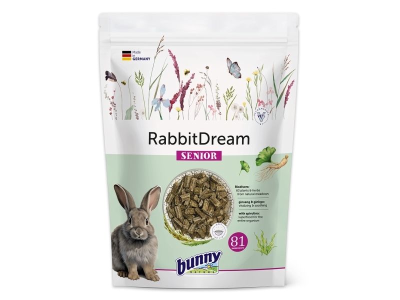 Beskrivelse fra Bunny Nature om RabbitDream SENIOR kaninfoder: Kaniner er af natur absolutte planteædere. Hele deres fysiologi, fra tænder til tarm, er tilpasset det. Desværre fodres mange kaniner stadig uvidende med en kost, der indeholder for mange kalorier/energi og for meget sukker. Hvis de fortsætter med at blive fodret på en måde, der ikke er artsrelevant, lider de ofte af sygdomme relateret til fødeindtagelse. Hele korn, bønner, ærteflager osv. er absolut ikke beregnet til at være en del af deres naturlige kost. Selvfølgelig er der masser af disse farverige og varierede blandinger, men de er ikke altid et sundt valg for dine kære pelsede kæledyr. Dog er det så let at skifte til en plantebaseret kost.