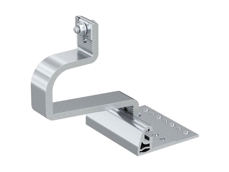 OBS! Denne produktbeskrivelse er endnu ikke blevet oversat til dansk af vores oversættere. Derfor er teksten maskineoversat fra den tyske originaltekst. Tagkrogen har tre indstillingselementer: Den vandrette indstilling på grundpladen gør det muligt at tilpasse den til tagstensformen, den nederste tilpasning til forskellige murtykkelser, den midterste lodrette indstilling gør det muligt at indstille afstanden mellem profil og murstensoverside Tagkrogen muliggør installationer både i høj- og tværformat (takket være LAB-vinkelholderen) Egnet til teglsten med en samlet tykkelse på 40 til 52 mm (571746) eller 52 til 67 mm (571748) Hurtigforbindelsen krog/skinne kræver ingen ekstra skruer Den brede grundplade giver en variabel fastgørelse på kontrapladen Mange forskellige huller øger valget ved fastgørelsesordrerne Den store bæreevne muliggør anvendelse af færre tagkroge Bestem akseafstanden på tagkrogene efter sne- og vindbelastninger på stedet, og fastlæg positionen alt efter bærestruktur og lokale forhold Hæv teglsten, og anbring krogens grundplade med den tilsvarende fastgørelse Foretag de højde- og breddeindstillinger, der er nødvendige for at dække redningen, og tilspænd skruerne i det justerbare led for at sikre krogen i sin position Før leddet på krogens overside ind i den sidedele på den anvendte skinne. Leddet kan drejes til tilpasning til solcellLight- eller solcellFish-skinner Stejle tag med mursten af forskellig tykkelse