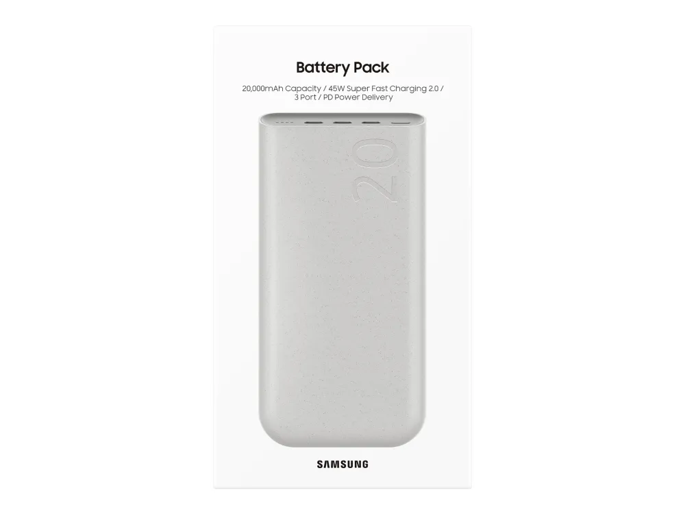Super Fast Charging on-the-go The 45W high-capacity 20,000mAh Battery Pack with super-fast charging 2.0 allows you to rapidly recharge compatible third-party and Samsung devices, including the battery pack itself, when it's low. Equipped with Power Delivery 3.0 and USB-C to ensure you can charge your devices on the go.