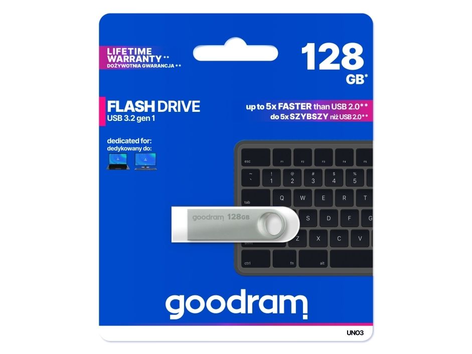 The GOODRAM UNO3 USB flash drive offers reliable performance with a storage capacity of 128 GB, catering to a variety of data storage needs. Designed with COB technology, this flash drive ensures durability and efficiency while being lightweight and portable. It delivers read rates of up to 60 MB/s and write rates reaching 20 MB/s, allowing for quick data transfer and easy access to files, making it an ideal solution for both everyday and professional users.